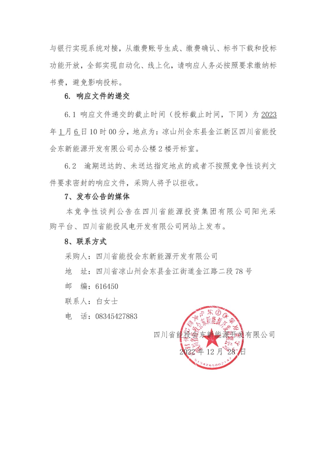6.1 响应文件递交的截止时间(投标截止时间,下同)为2023年1月6日10时00分,地点为:凉山州会东县金江新区四川省能投会东新能源开发有限公司办公楼2楼开标室。