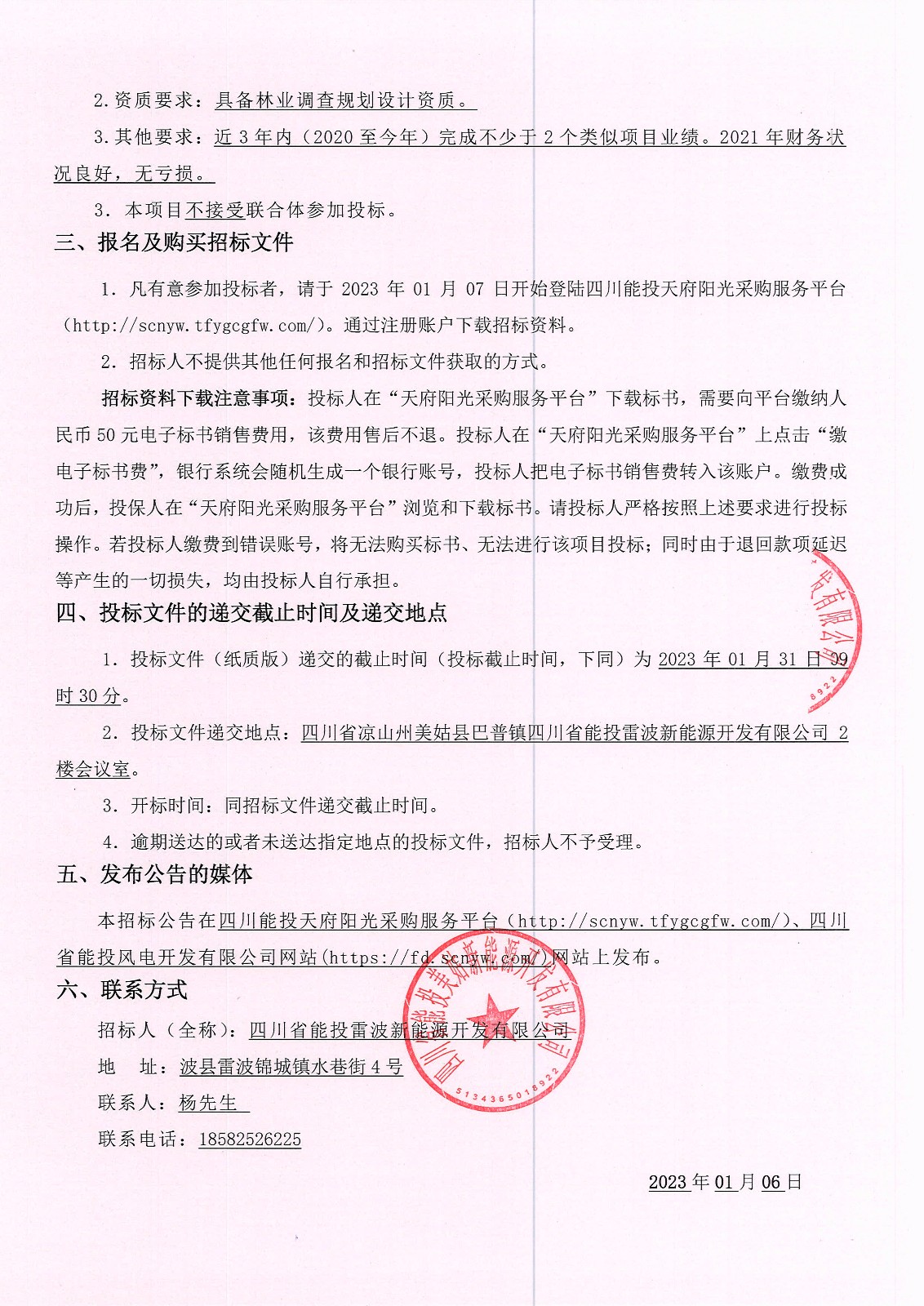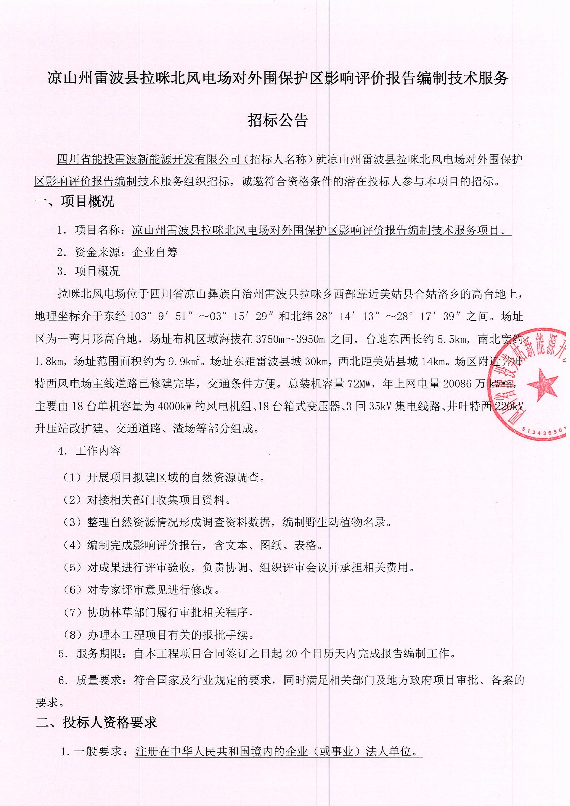 四川省能投雷波新能源开发有限公司(招标人名称)就凉山州雷波县拉咪北风电场对外围保护区影响评价报告编制技术服务组织招标,诚邀符合资格条件的潜在投标人参与本项目的招标。
