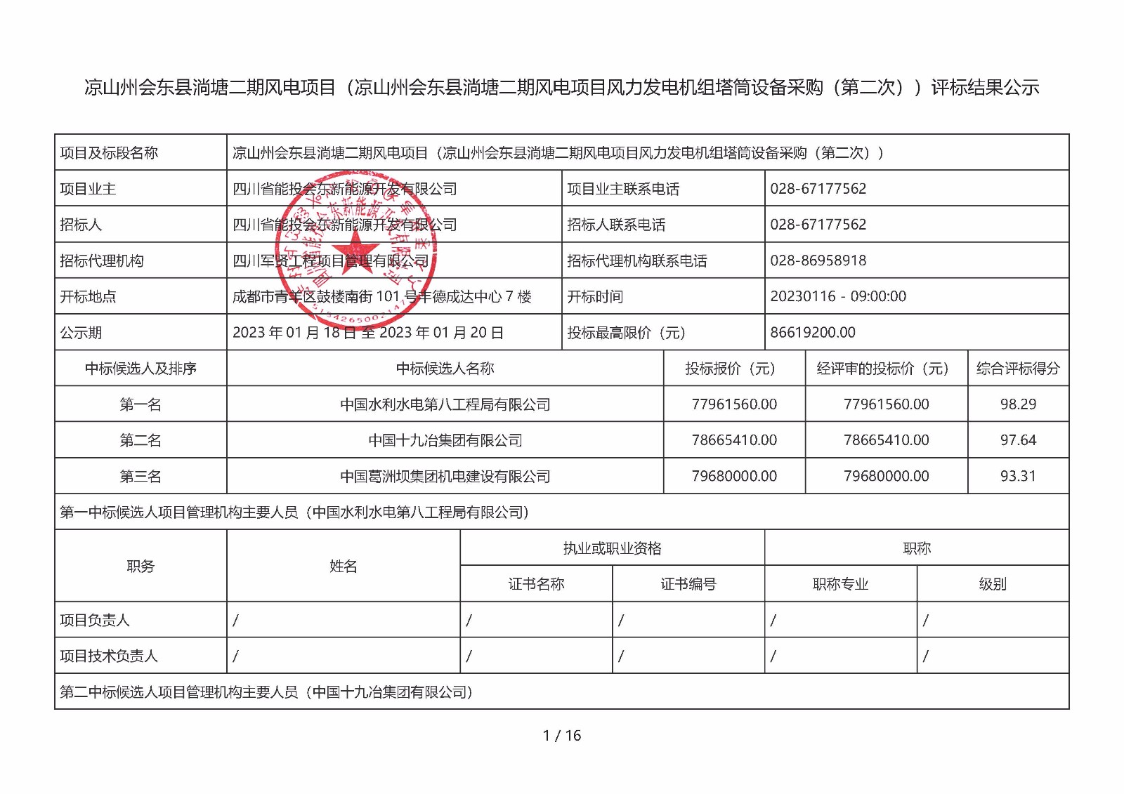 凉山州会东县淌塘二期风电项目风力发电机组塔筒设备采购中标候选人公示