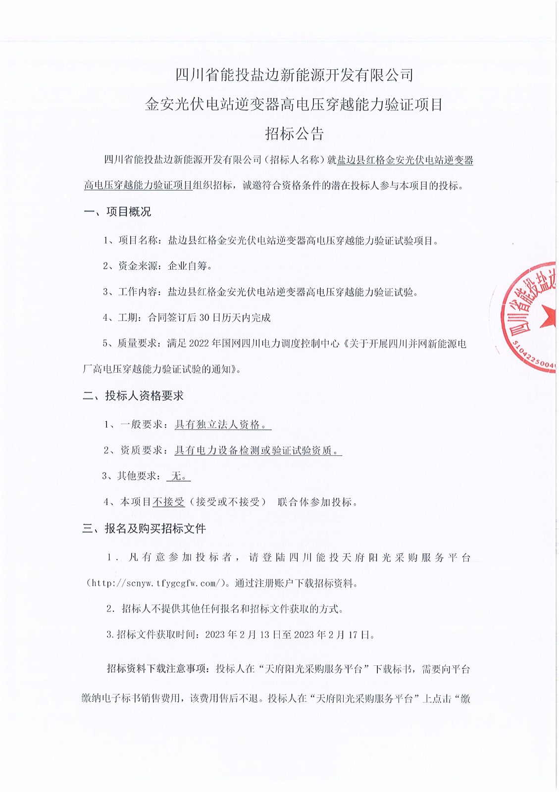 四川省能投盐边新能源开发有限公司(招标人名称)就盐边县红格金安光伏电站逆变器高电压穿越能力验证项目组织招标,诚邀符合资格条件的潜在投标人参与本项目的投标。