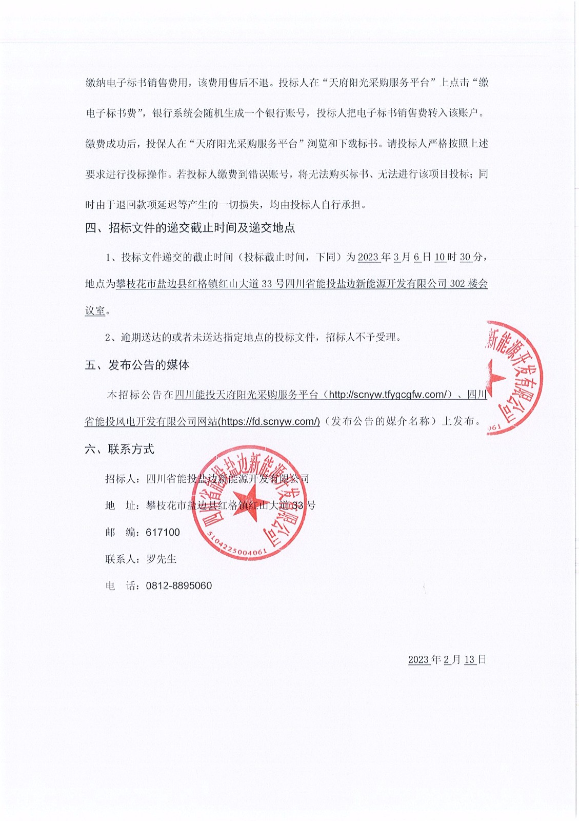 1、投标文件递交的截止时间(投标截止时间,下同)为2023年3月6日10时30分,地点为攀枝花市盐边县红格镇红山大道33号四川省能投盐边新能源开发有限公司302楼会议室。