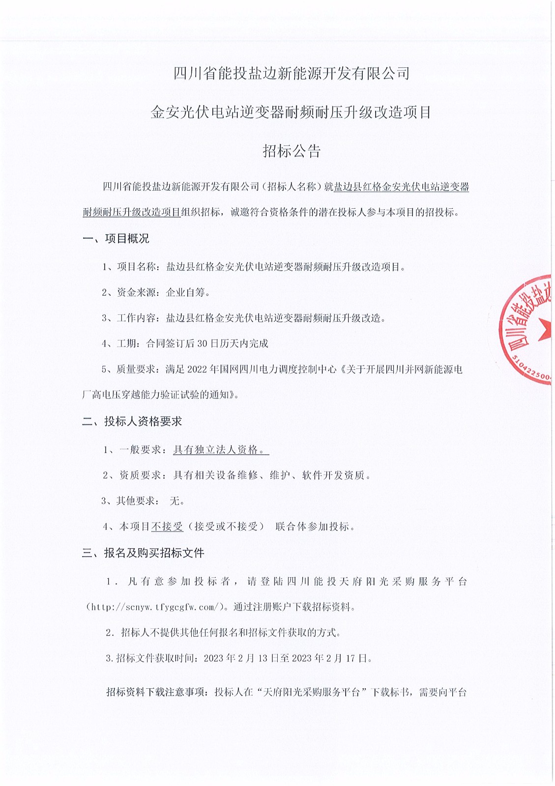 四川省能投盐边新能源开发有限公司(招标人名称)就盐边县红格金安光伏电站逆变器耐频耐压升级改造项目组织招标,诚邀符合资格条件的潜在投标人参与本项目的招投标。