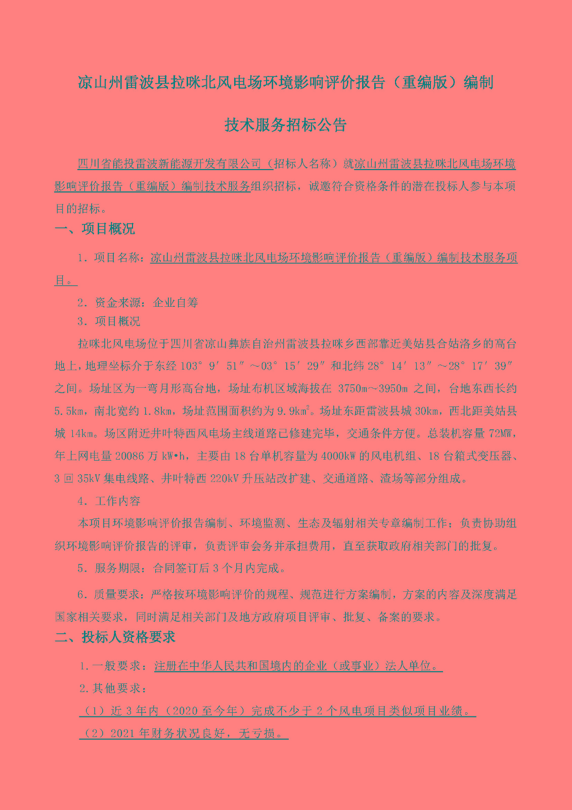 1.项目名称:凉山州雷波县拉咪北风电场环境影响评价报告(重编版)编制技术服务项目。