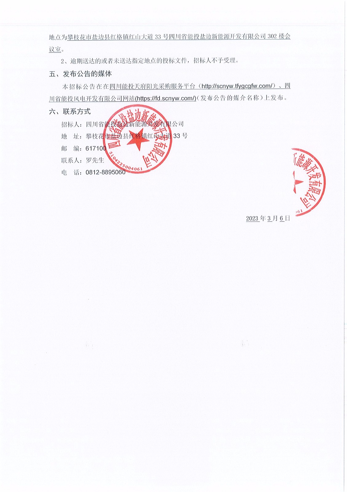 1、投标文件递交的截止时间(投标截止时间,下同)为2023年3月27日10时00分,地点为攀枝花市盐边县红格镇红山大道33号四川省能投盐边新能源开发有限公司302楼会议室。