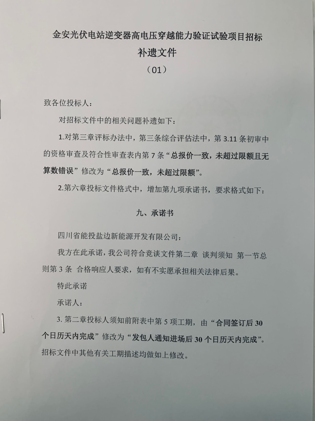 金安光伏电站逆变器高压穿越能力验证试验项目招标补遗文件(01)