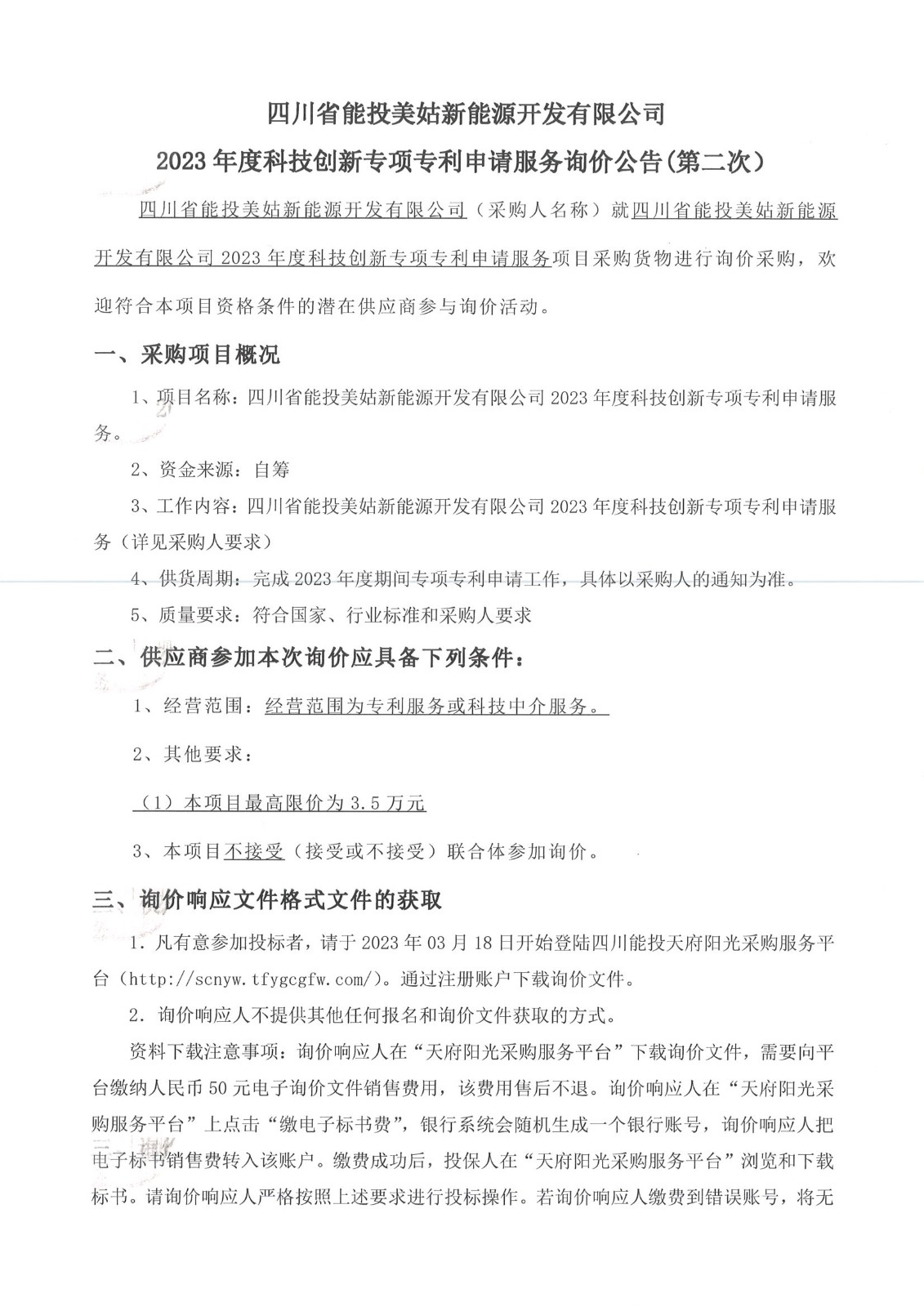 3、工作内容:四川省能投美姑新能源开发有限公司2023年度科技创新专项专利申请服务(详见采购人要求)