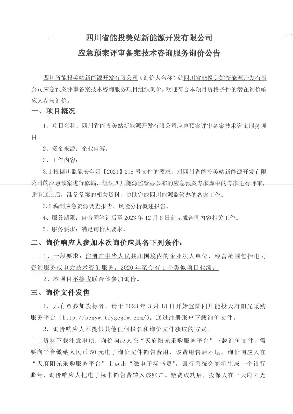 四川省能投美姑新能源开发有限公司(询价人名称)就四川省能投美姑新能源开发有限公司应急预案评审备案技术咨询服务项目组织询价,欢迎符合本项目资格条件的潜在询价响应人参与询价。