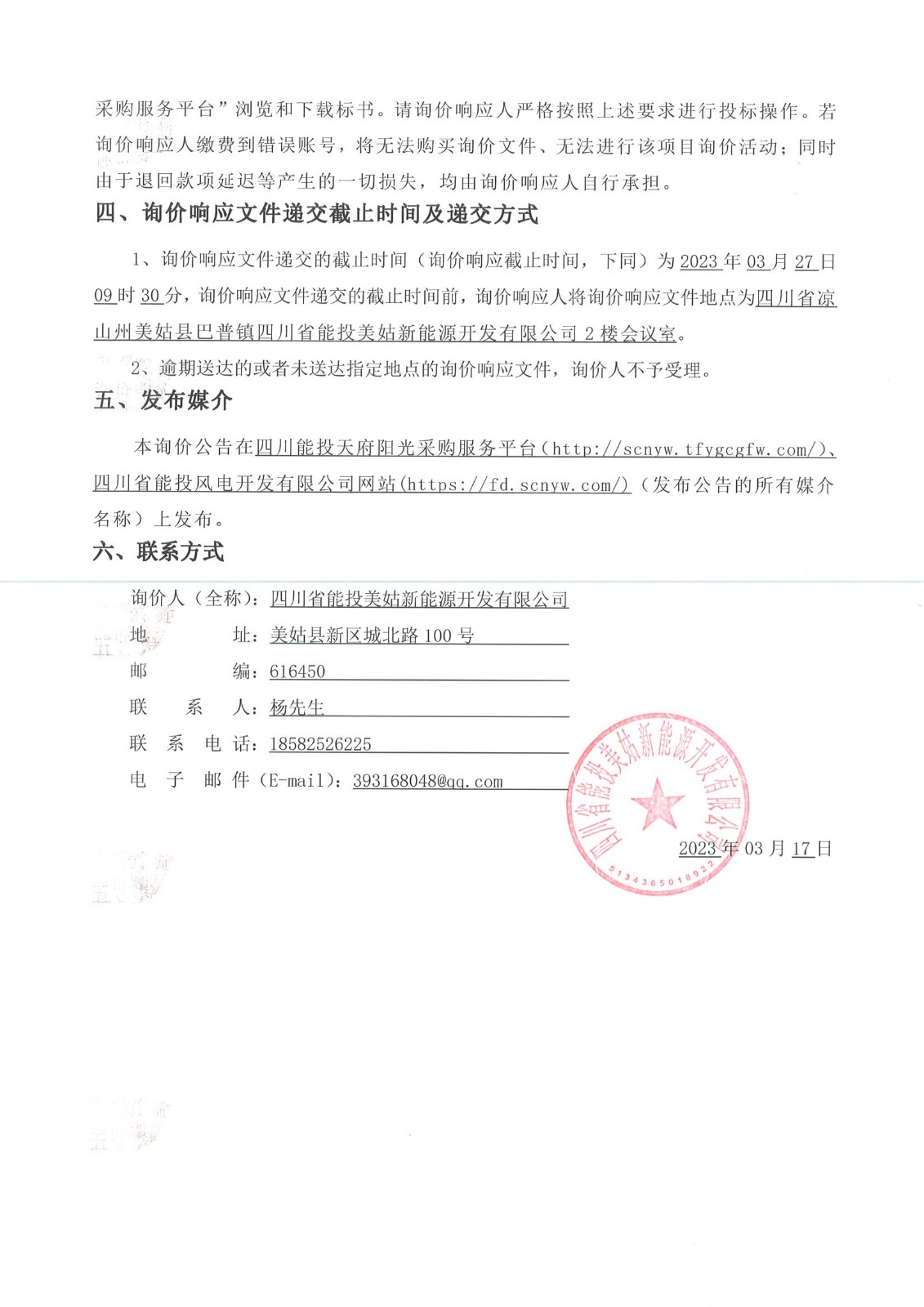 1、询价响应文件递交的截止时间(询价响应截止时间,下同)为2023年03月27日09时30分,询价响应文件递交的截止时间前,询价响应人将询价响应文件地点为四川省凉山州美姑县巴普镇四川省能投美姑新能源开发有限公司2楼会议室。