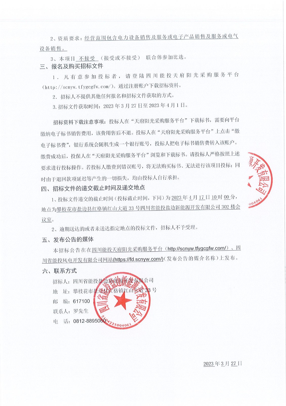 1、投标文件递交的截止时间(投标截止时间,下同)为2023年4月17日10时00分,地点为攀枝花市盐边县红格镇红山大道33号四川省能投盐边新能源开发有限公司302楼会议室。