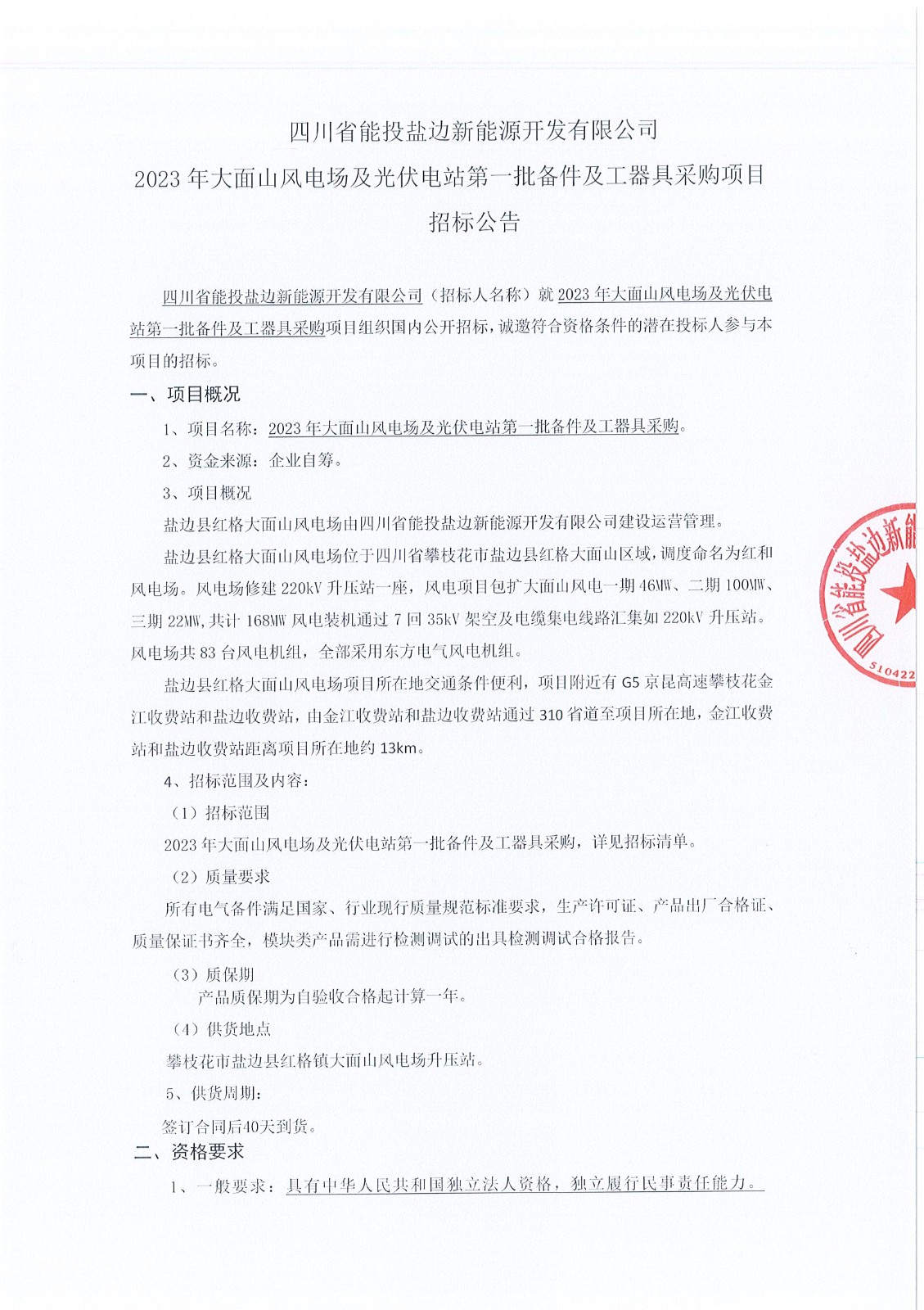 四川省能投盐边新能源开发有限公司(招标人名称)就2023年大面山风电场及光伏电站第一批备件及工器具采购项目组织国内公开招标,诚邀符合资格条件的潜在投标人参与本项目的招标。
