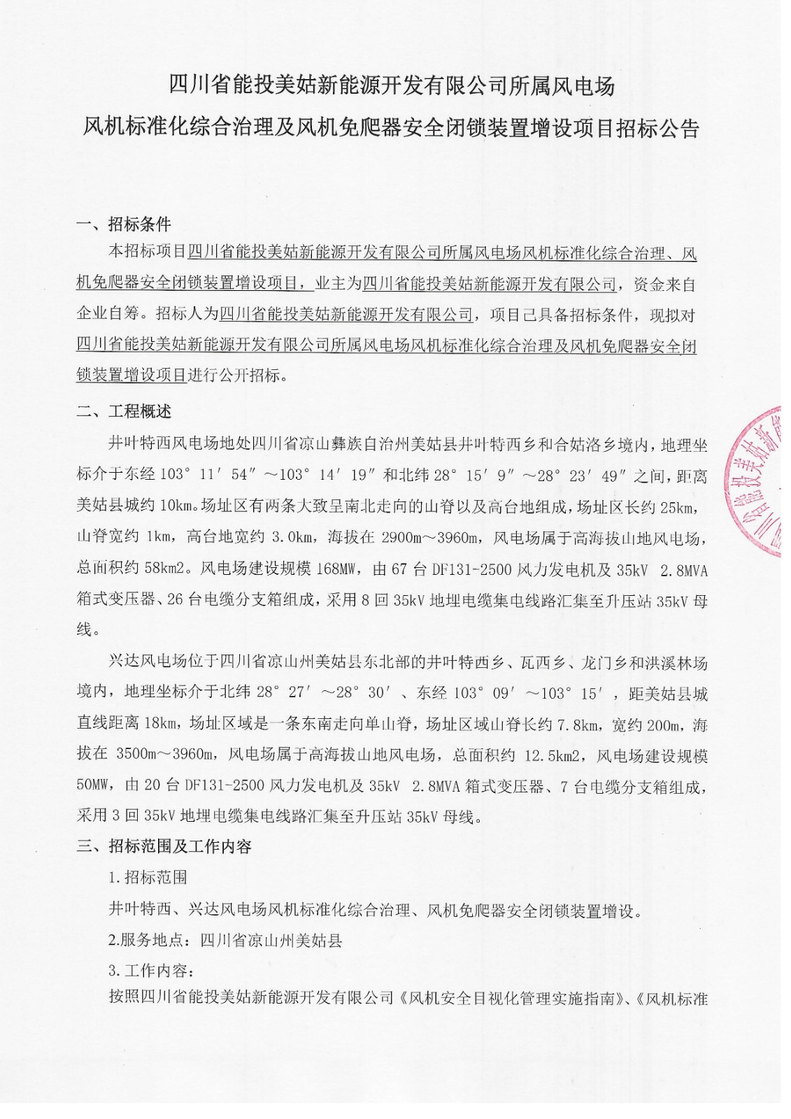 本招标项目四川省能投美姑新能源开发有限公司所属风电场风机标准化综合治理、风机免爬器安全闭锁装置增设项目,业主为四川省能投美姑新能源开发有限公司,资金来自企业自筹。招标人为四川省能投美姑新能源开发有限公司,项目己具备招标条件,现拟对四川省能投美姑新能源开发有限公司所属风电场风机标准化综合治理及风机免爬器安全闭锁装置增设项目进行公开招标。