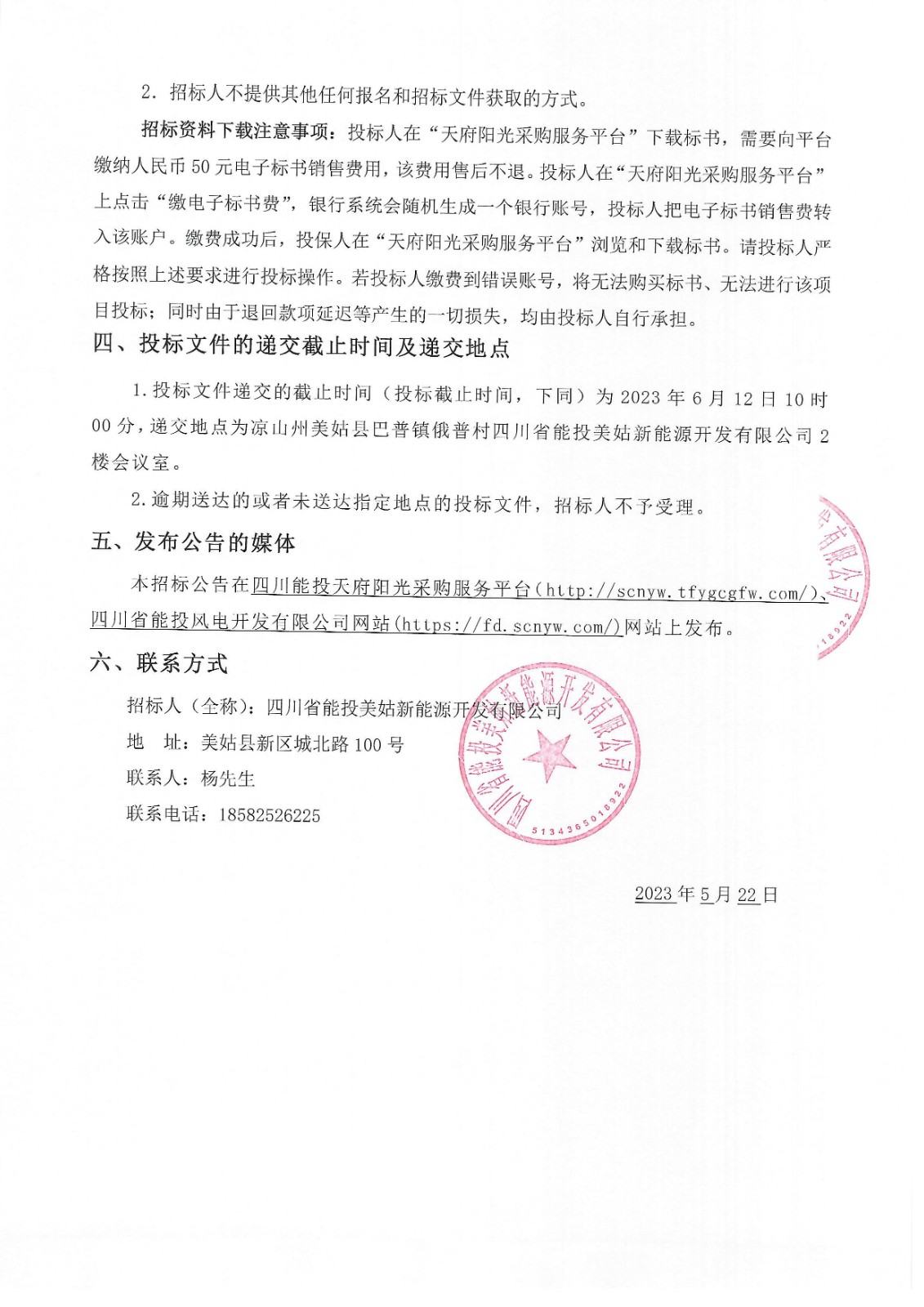 1.投标文件递交的截止时间(投标截止时间,下同)为2023年6月12日10时00分,递交地点为凉山州美姑县巴普镇俄普村四川省能投美姑新能源开发有限公司2楼会议室。