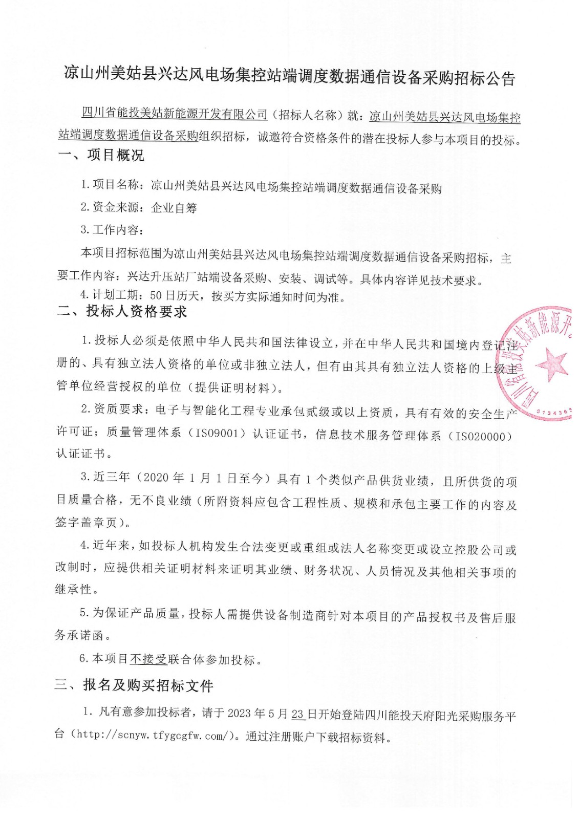 四川省能投美姑新能源开发有限公司(招标人名称)就:凉山州美姑县兴达风电场集控站端调度数据通信设备采购组织招标,诚邀符合资格条件的潜在投标人参与本项目的投标。