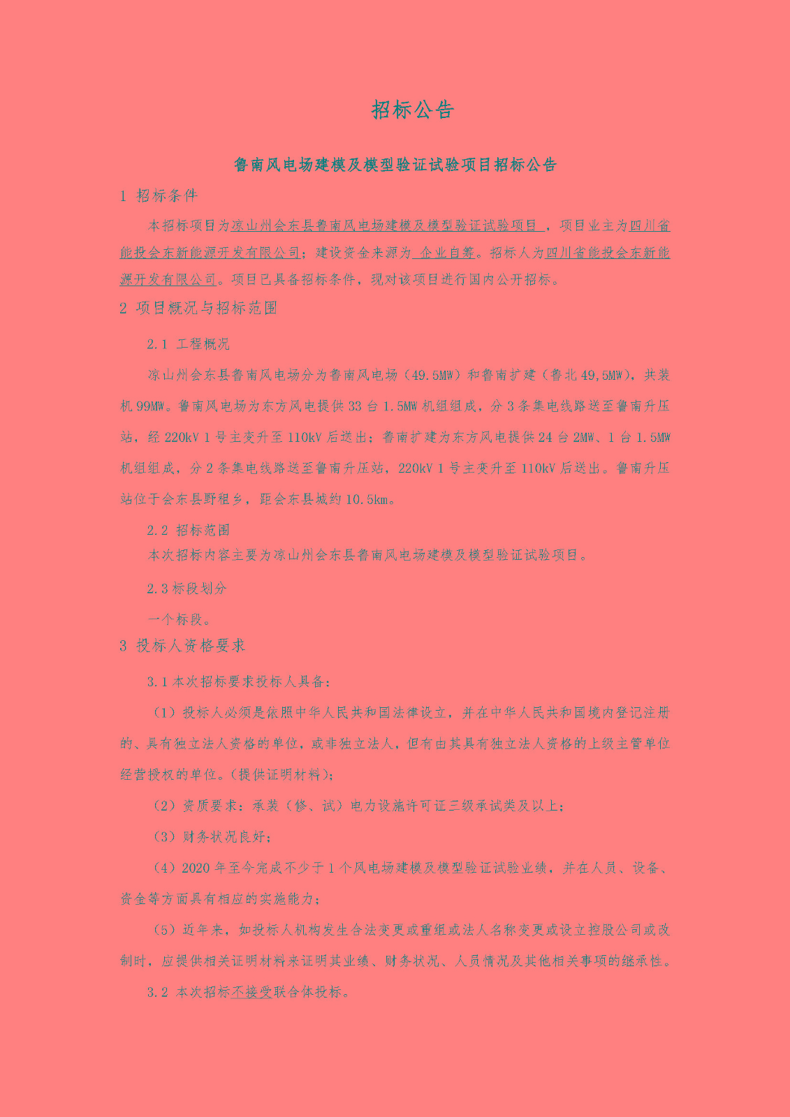 本招标项目为凉山州会东县鲁南风电场建模及模型验证试验项目 ,项目业主为四川省能投会东新能源开发有限公司;建设资金来源为 企业自筹。招标人为四川省能投会东新能源开发有限公司。项目已具备招标条件,现对该项目进行国内公开招标。