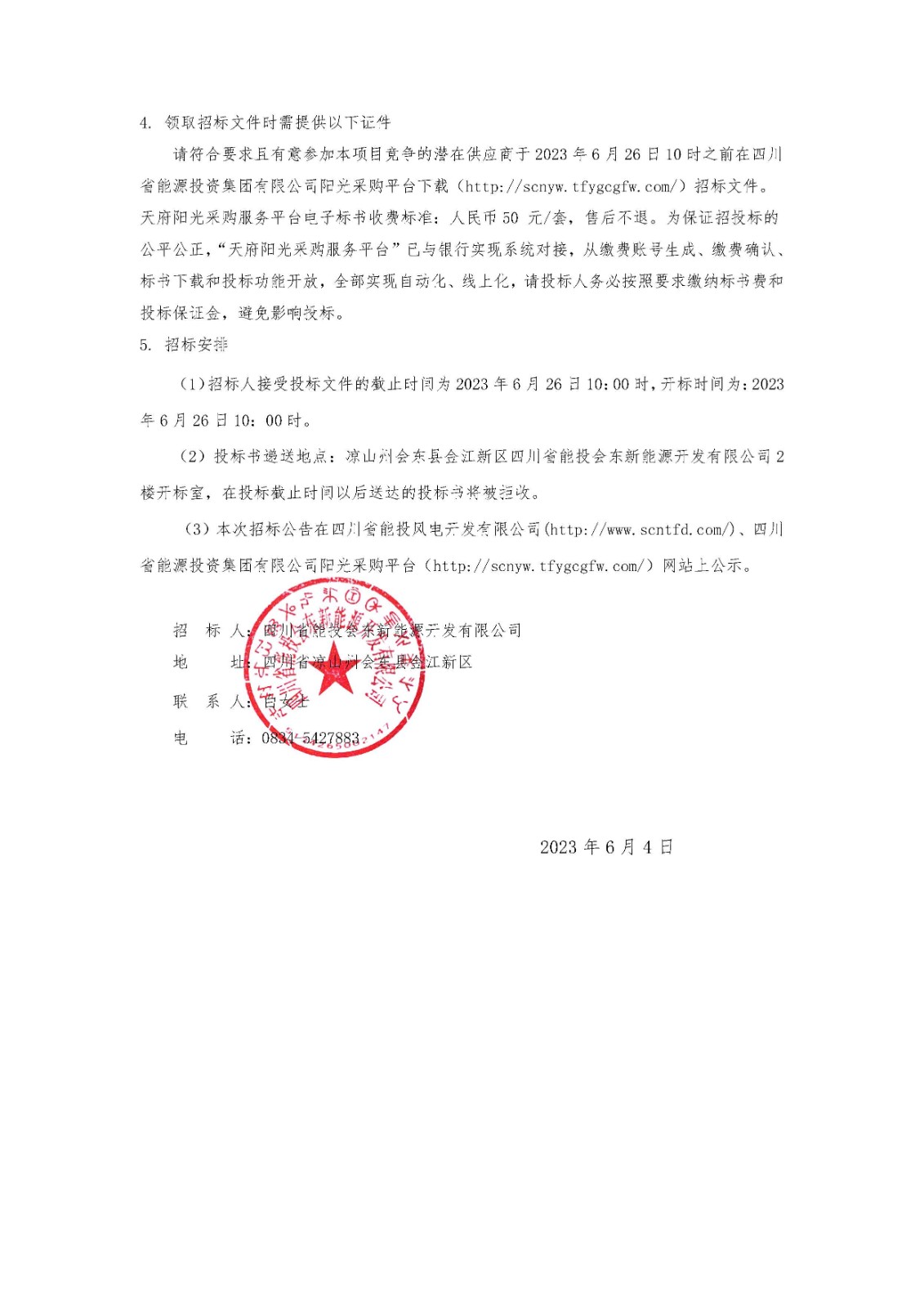 请符合要求且有意参加本项目竞争的潜在供应商于2023年6月26日10时之前在四川省能源投资集团有限公司阳光采购平台下载(http://scnyw.tfygcgfw.com/)招标文件。