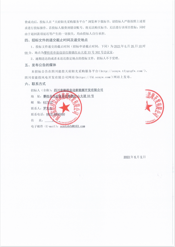 1、投标文件递交的截止时间(招标申请截止时间,下同)为2023年6月26日10时00分,地点为攀枝花市盐边县红格镇红山大道33号302号会议室。