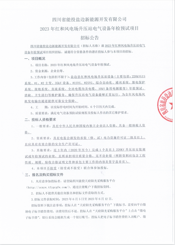 四川省能投盐边新能源开发有限公司(招标人名称)就2023年红和风电场升压站电气设备年检预试项目组织招标,诚邀符合资格条件的潜在投标人参与本项目的招标。