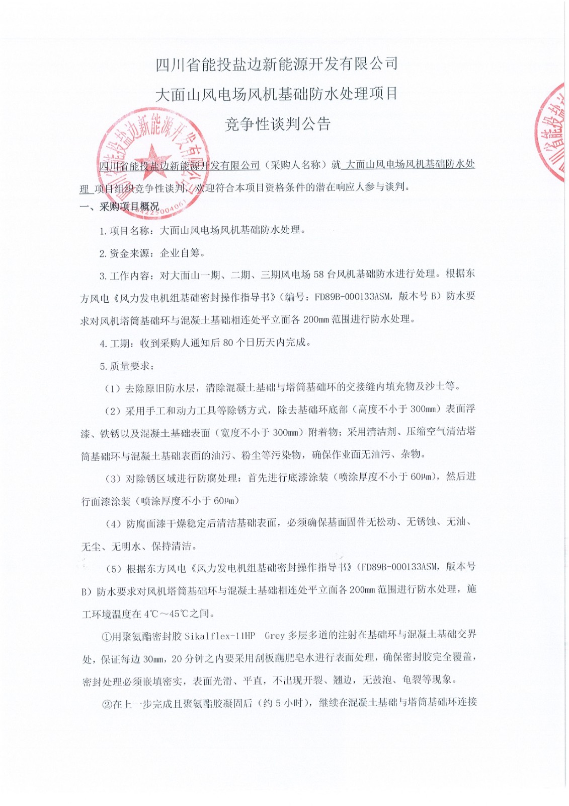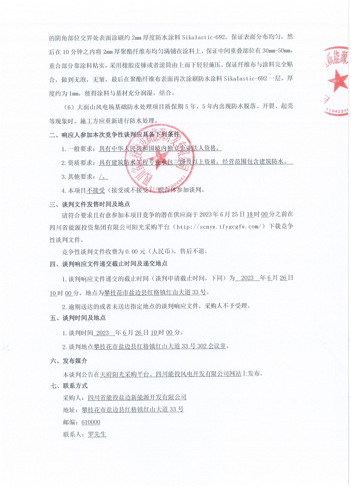 四川省能投盐边新能源开发有限公司(采购人名称)就 大面山风电场风机基础防水处理 项目组织竞争性谈判,欢迎符合本项目资格条件的潜在响应人参与谈判。