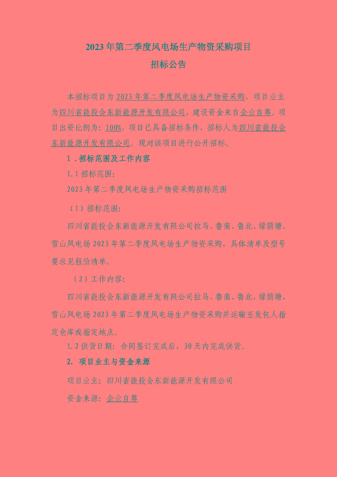 本招标项目为2023年第二季度风电场生产物资采购,项目业主为四川省能投会东新能源开发有限公司,建设资金来自企业自筹。项目出资比例为:100%,项目已具备招标条件,招标人为四川省能投会东新能源开发有限公司。现对该项目进行公开招标。