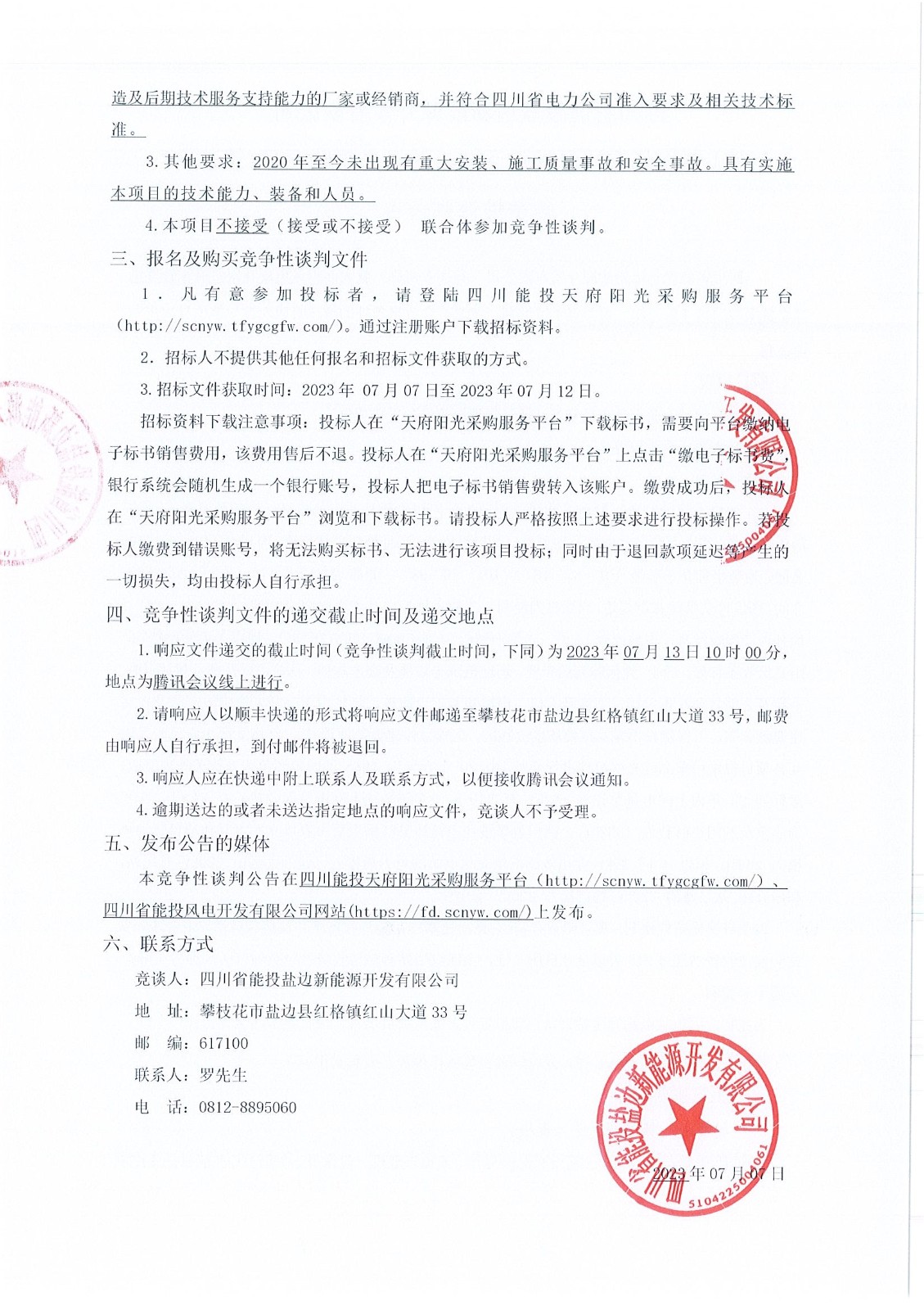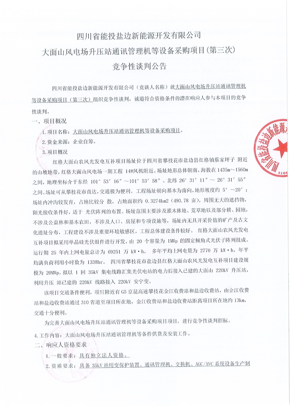 四川省能投盐边新能源开发有限公司(竞谈人名称)就大面山风电场升压站通讯管理机等设备采购项目(第三次)组织竞争性谈判,诚邀符合资格条件的潜在响应人参与本项目的竞争性谈判。