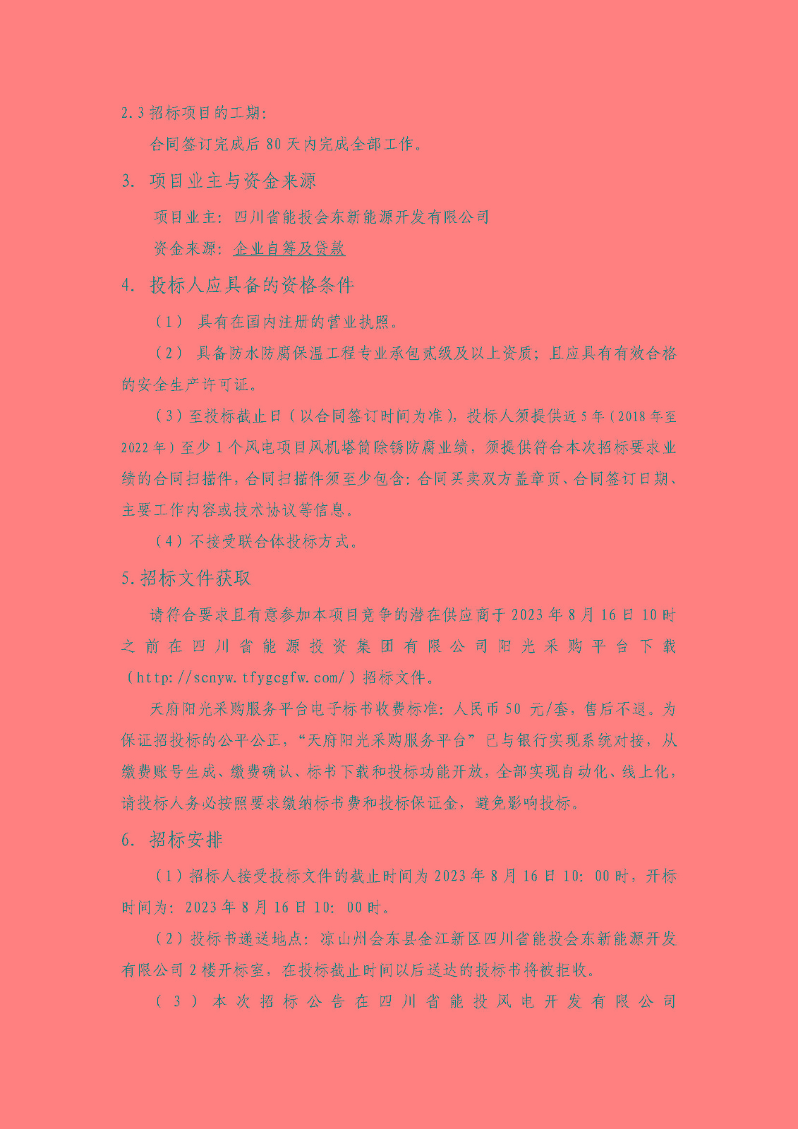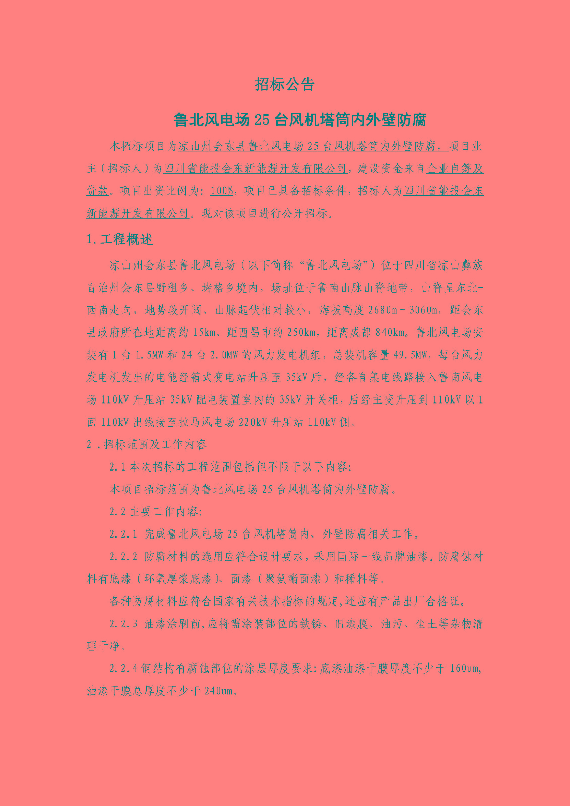 本招标项目为凉山州会东县鲁北风电场25台风机塔筒内外壁防腐,项目业主(招标人)为四川省能投会东新能源开发有限公司,建设资金来自企业自筹及贷款。项目出资比例为:100%,项目已具备招标条件,招标人为四川省能投会东新能源开发有限公司。现对该项目进行公开招标。