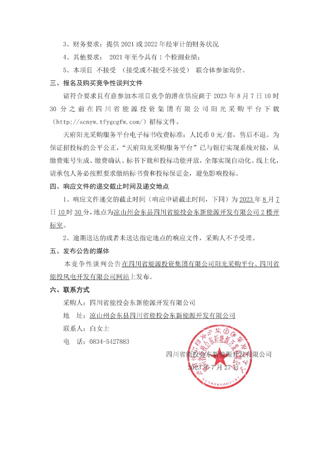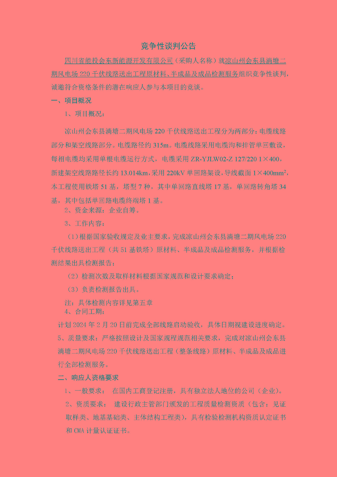 四川省能投会东新能源开发有限公司(采购人名称)就凉山州会东县淌塘二期风电场220千伏线路送出工程原材料、半成品及成品检测服务组织竞争性谈判,诚邀符合资格条件的潜在响应人参与本项目的竞谈。