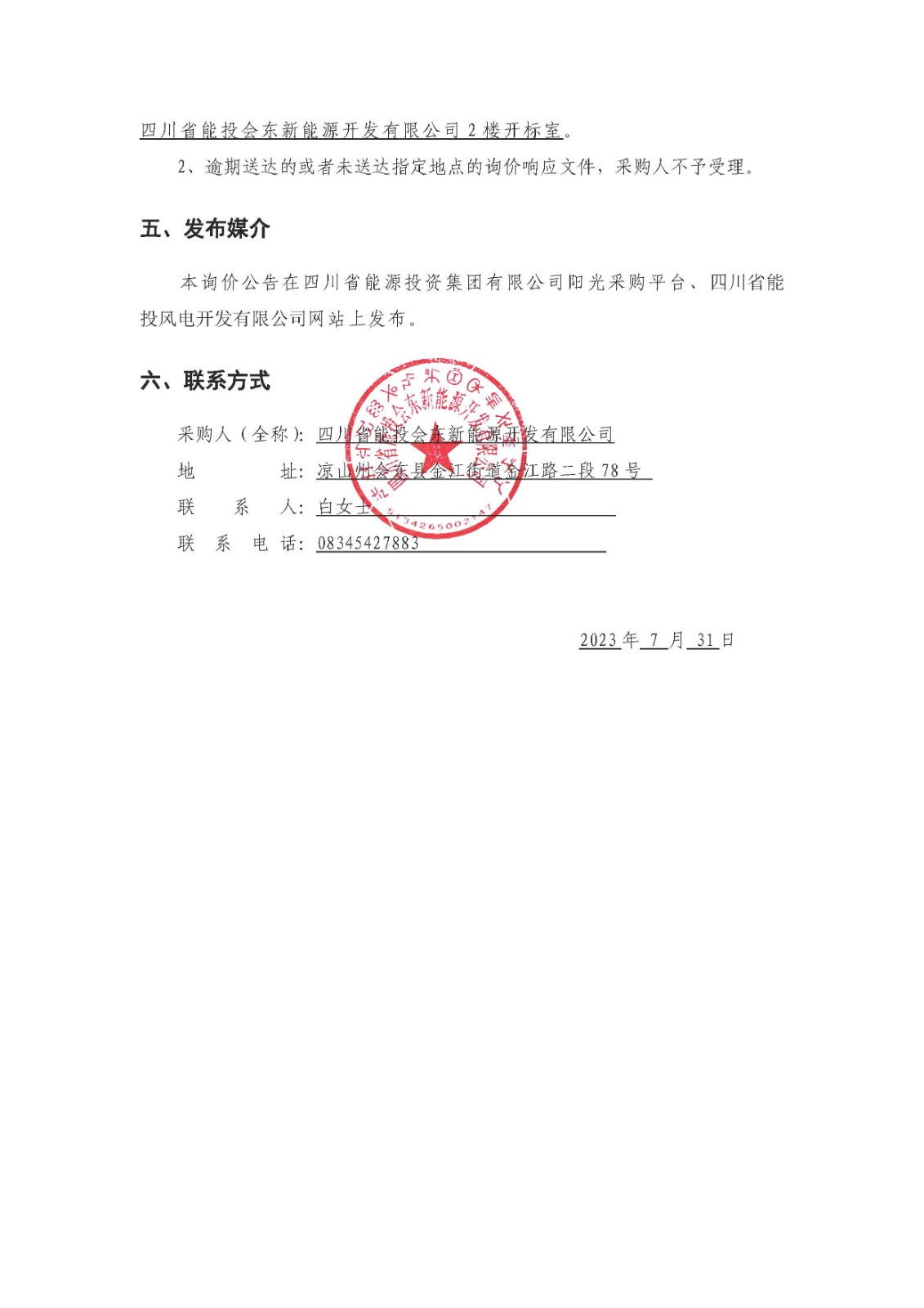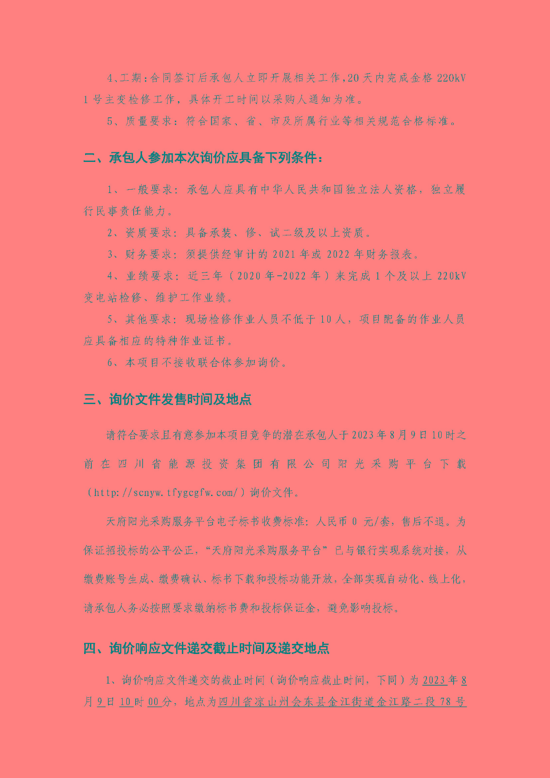 请符合要求且有意参加本项目竞争的潜在承包人于2023年8月9日10时之前在四川省能源投资集团有限公司阳光采购平台下载(http://scnyw.tfygcgfw.com/)询价文件。