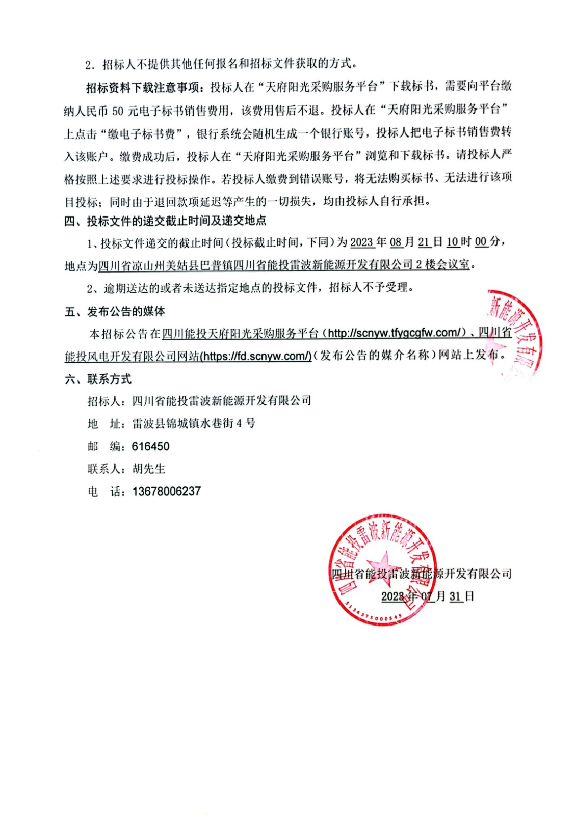 1、投标文件递交的截止时间(投标截止时间,下同)为2023年08月21日10时00分,地点为四川省凉山州美姑县巴普镇四川省能投雷波新能源开发有限公司2楼会议室。