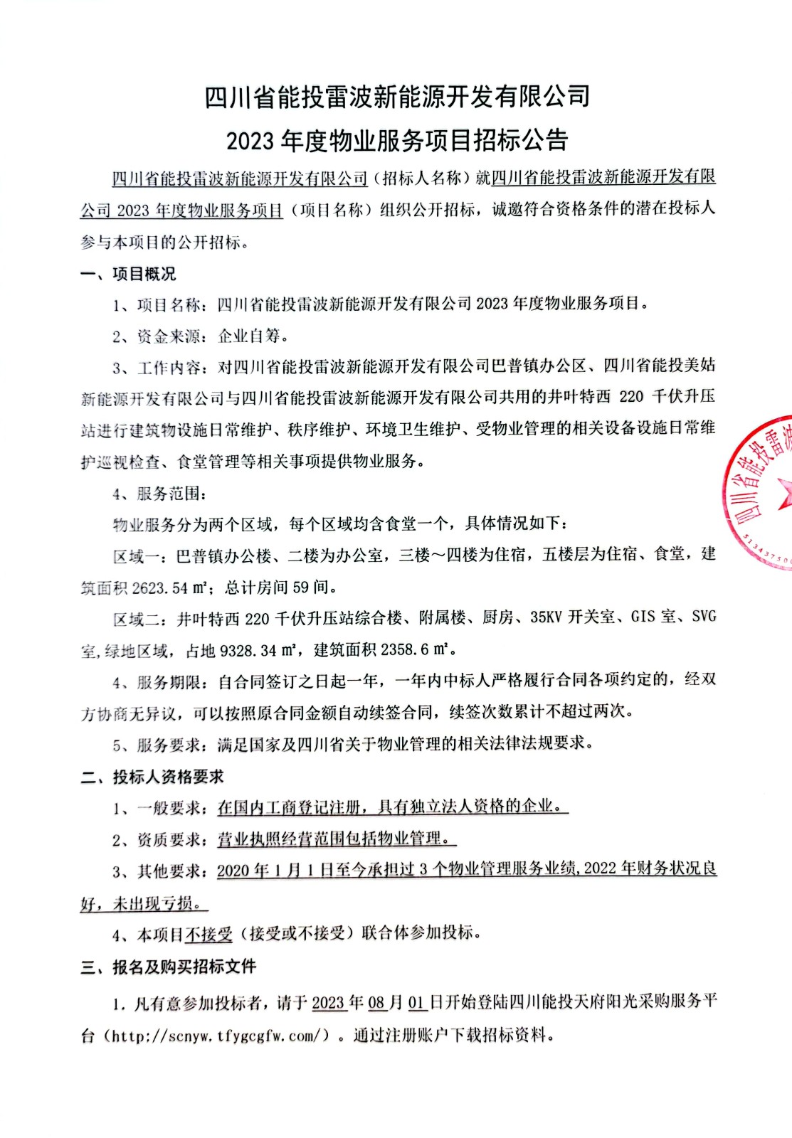 四川省能投雷波新能源开发有限公司(招标人名称)就四川省能投雷波新能源开发有限公司2023年度物业服务项目(项目名称)组织公开招标,诚邀符合资格条件的潜在投标人参与本项目的公开招标。