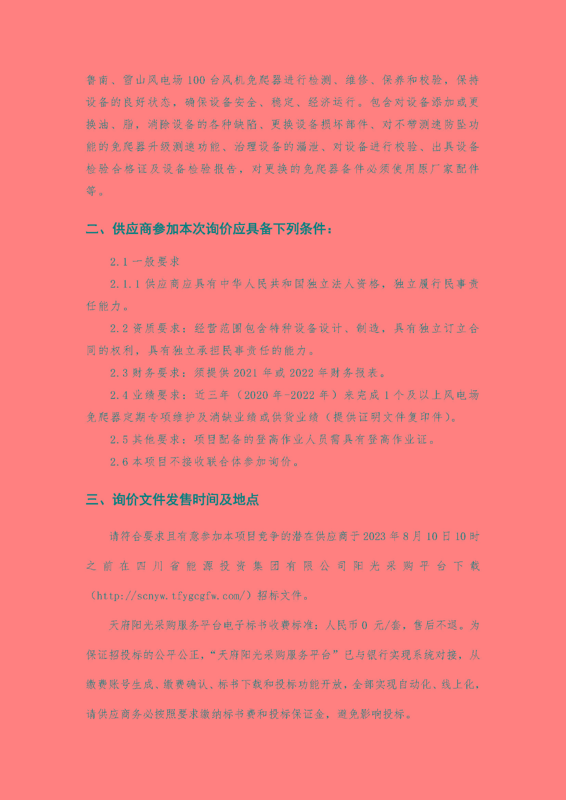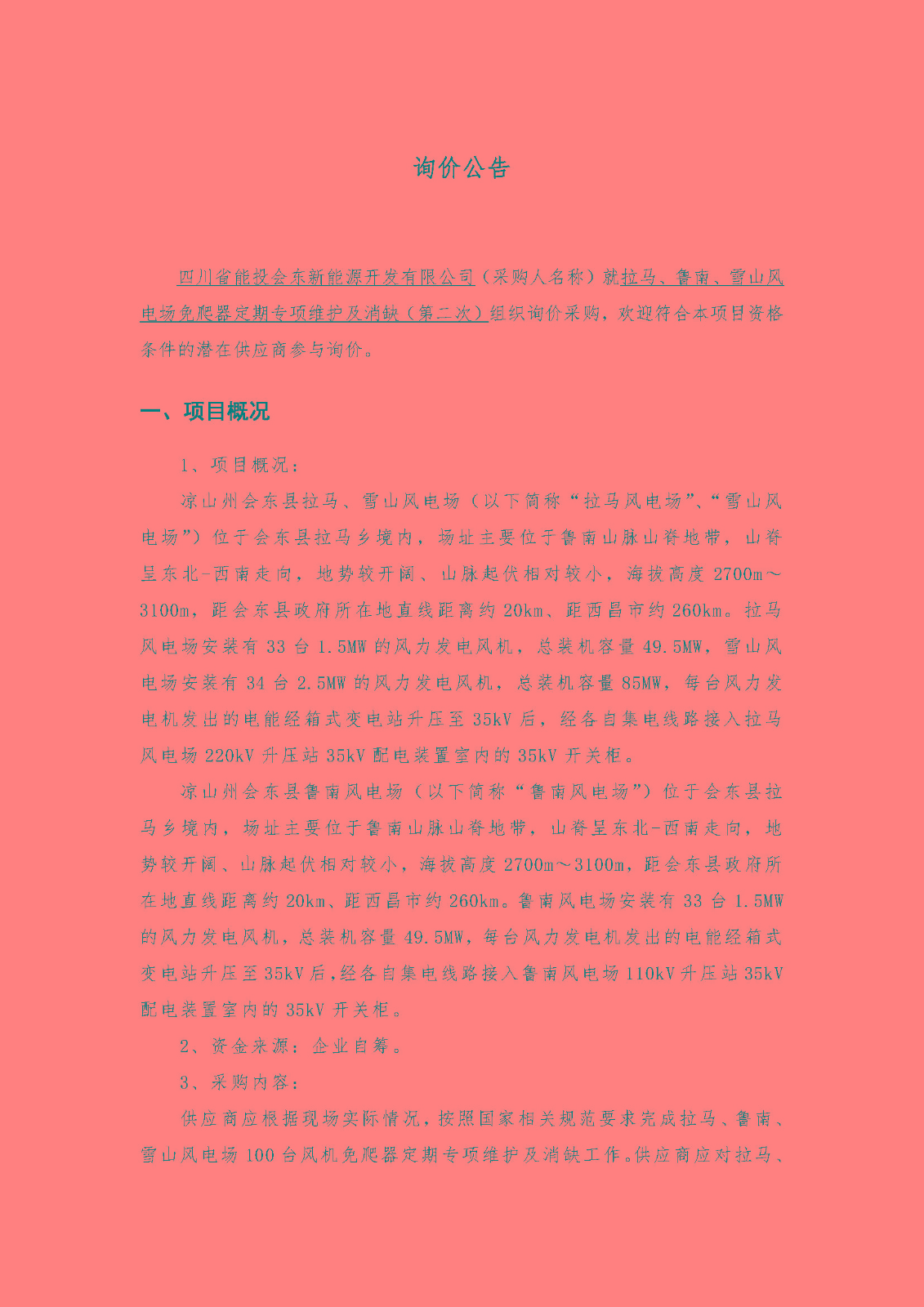四川省能投会东新能源开发有限公司(采购人名称)就拉马、鲁南、雪山风电场免爬器定期专项维护及消缺(第二次)组织询价采购,欢迎符合本项目资格条件的潜在供应商参与询价。