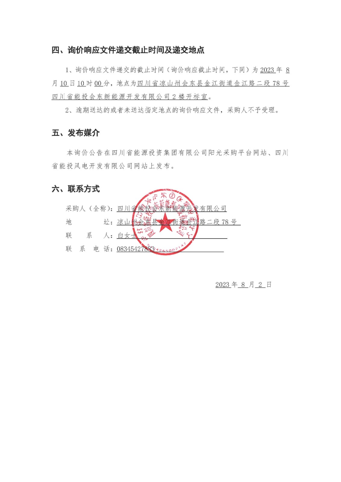 1、询价响应文件递交的截止时间(询价响应截止时间,下同)为2023年 8月10日10时00分,地点为四川省凉山州会东县金江街道金江路二段78号四川省能投会东新能源开发有限公司2楼开标室。