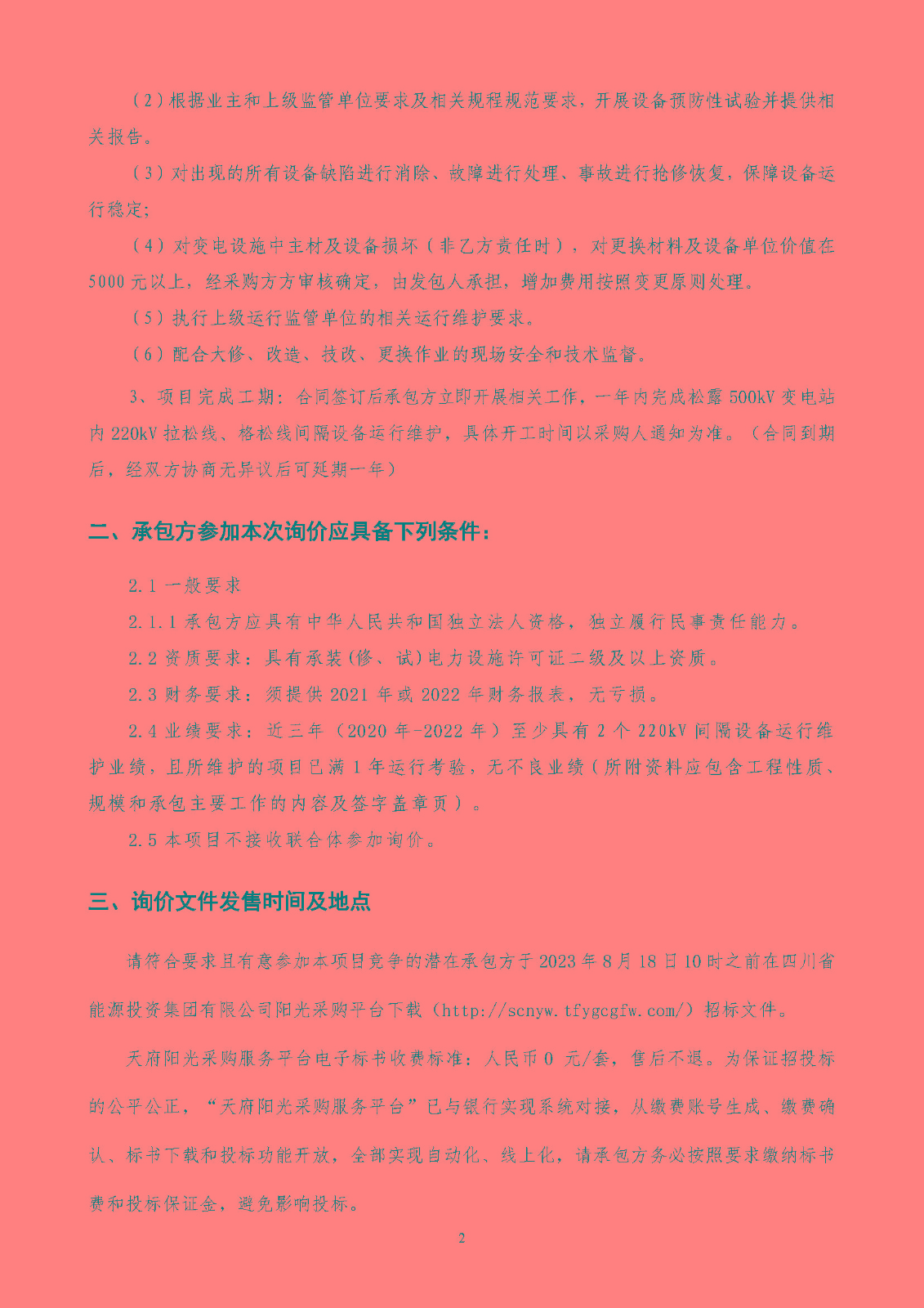 请符合要求且有意参加本项目竞争的潜在承包方于2023年8月18日10时之前在四川省能源投资集团有限公司阳光采购平台下载(http://scnyw.tfygcgfw.com/)招标文件。