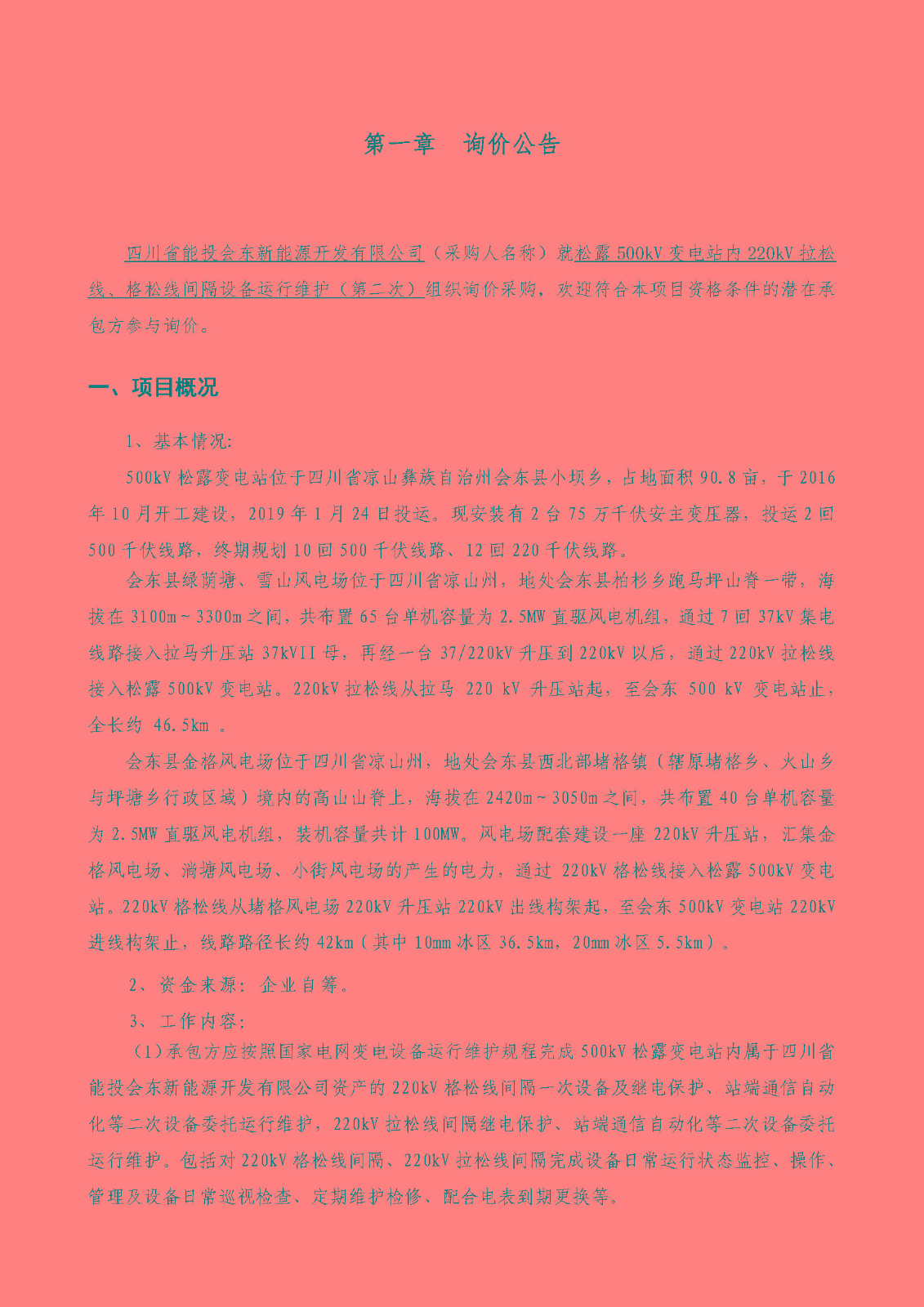 四川省能投会东新能源开发有限公司(采购人名称)就松露500kV变电站内220kV拉松线、格松线间隔设备运行维护(第二次)组织询价采购,欢迎符合本项目资格条件的潜在承包方参与询价。