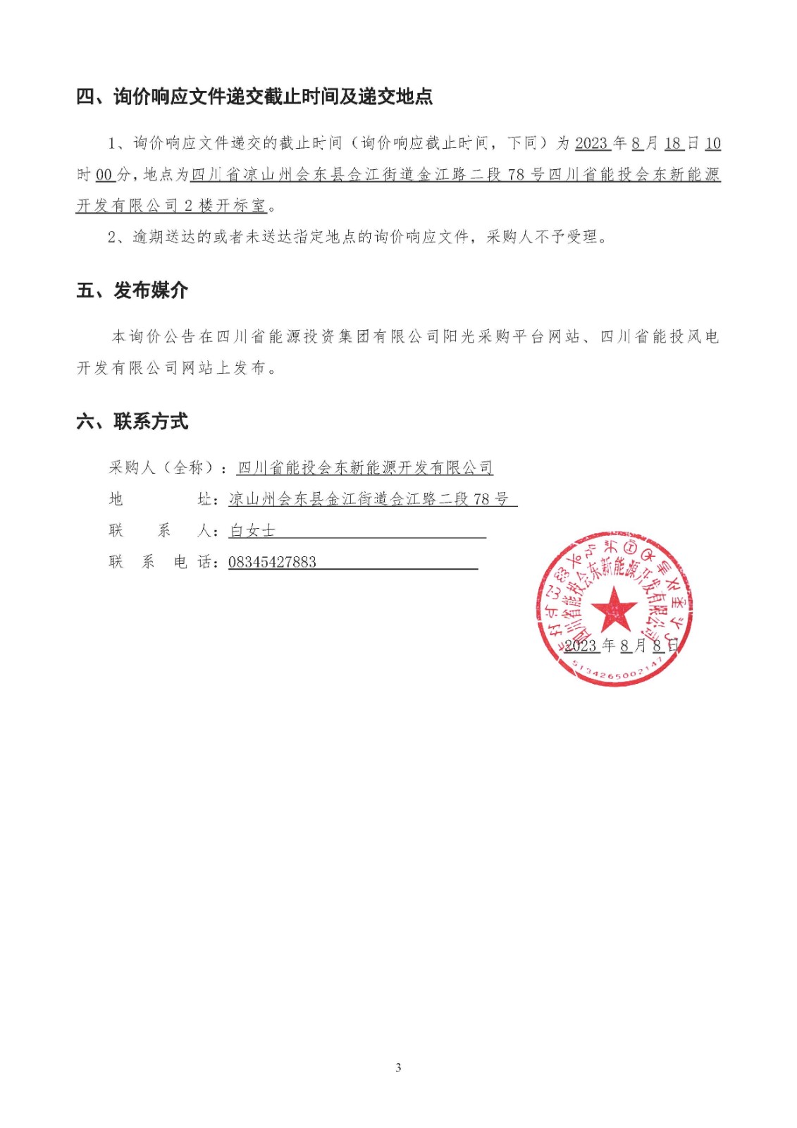 1、询价响应文件递交的截止时间(询价响应截止时间,下同)为2023年8月18日10时00分,地点为四川省凉山州会东县金江街道金江路二段78号四川省能投会东新能源开发有限公司2楼开标室。