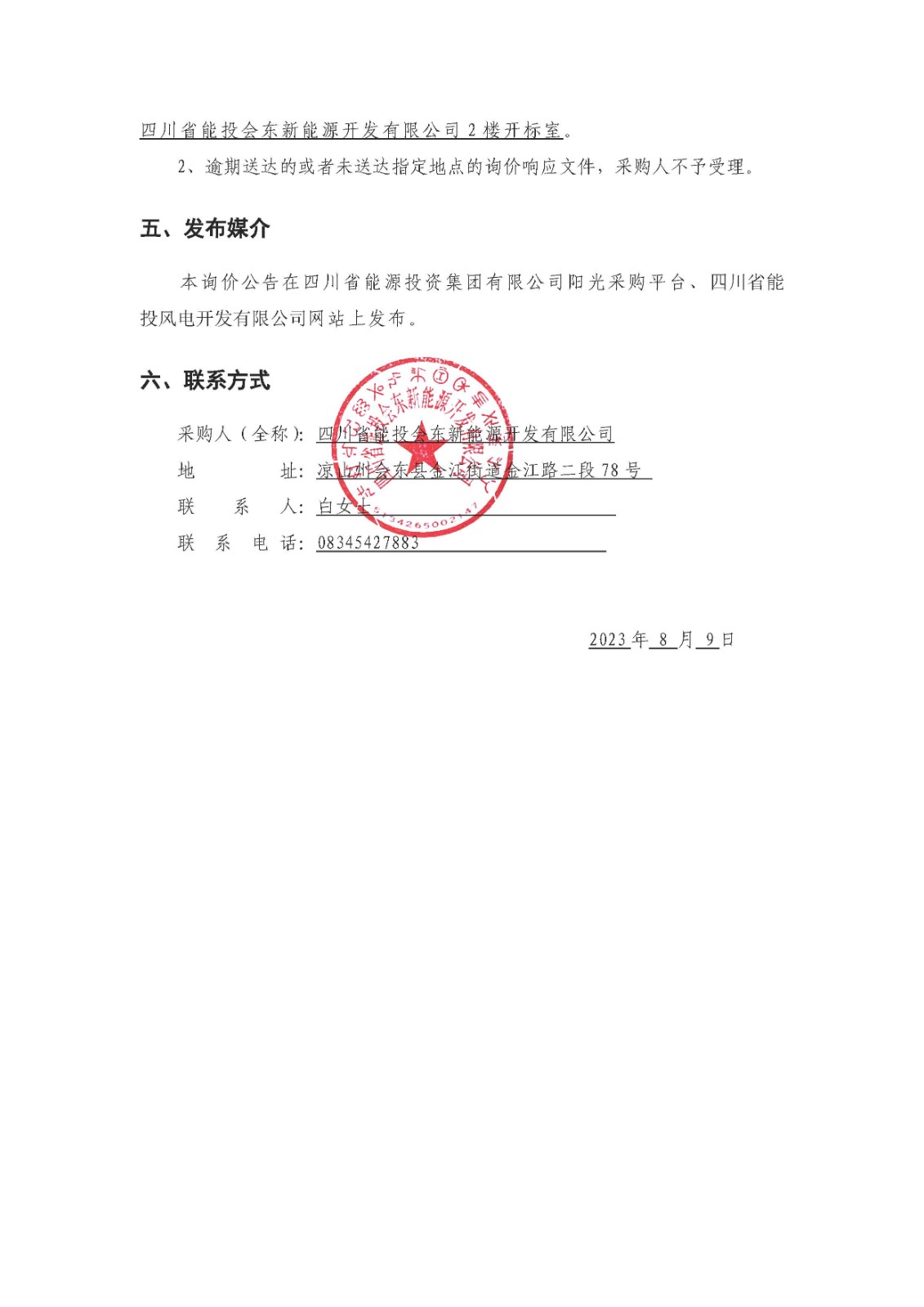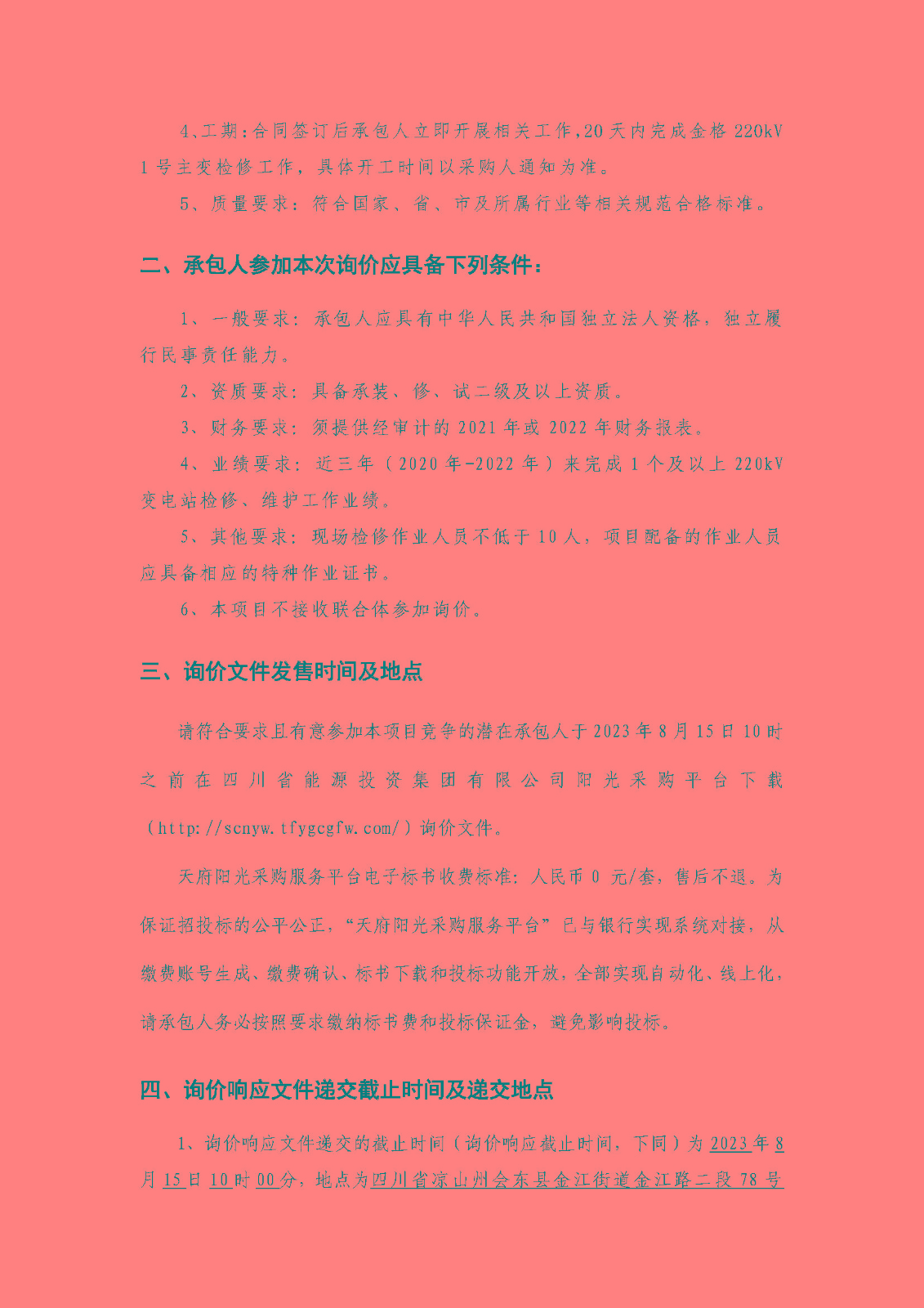 请符合要求且有意参加本项目竞争的潜在承包人于2023年8月15日10时之前在四川省能源投资集团有限公司阳光采购平台下载(http://scnyw.tfygcgfw.com/)询价文件。