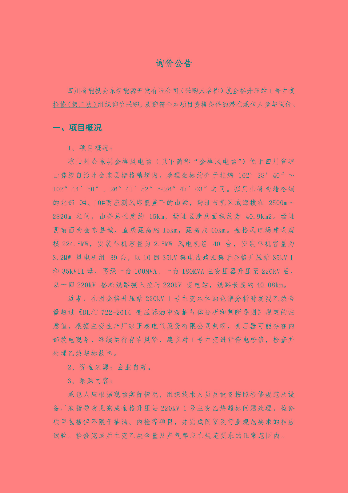 四川省能投会东新能源开发有限公司(采购人名称)就金格升压站1号主变检修(第二次)组织询价采购,欢迎符合本项目资格条件的潜在承包人参与询价。