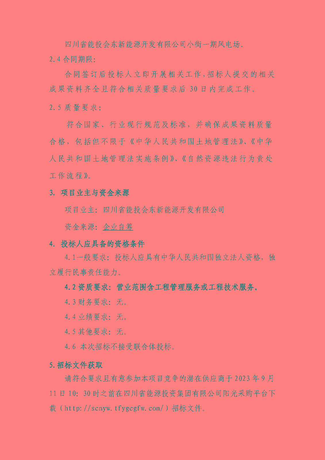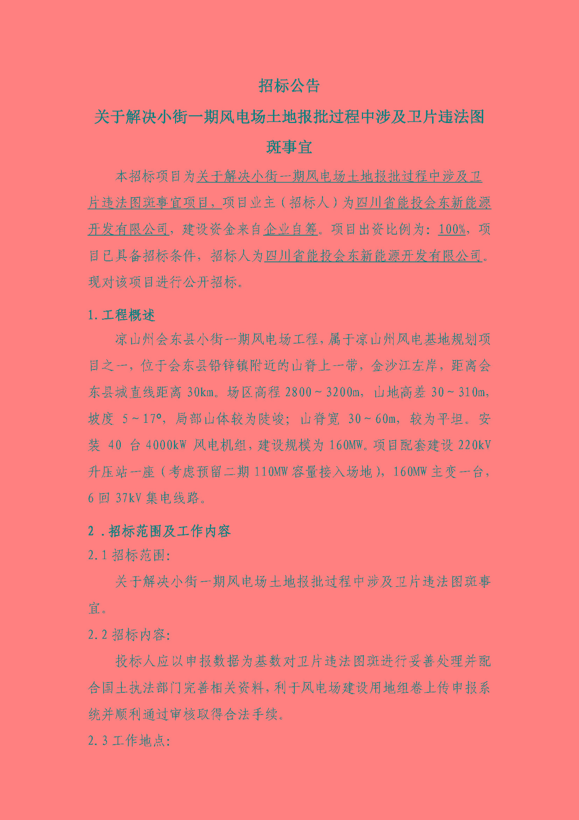 本招标项目为关于解决小街一期风电场土地报批过程中涉及卫片违法图斑事宜项目,项目业主(招标人)为四川省能投会东新能源开发有限公司,建设资金来自企业自筹。项目出资比例为:100%,项目已具备招标条件,招标人为四川省能投会东新能源开发有限公司。现对该项目进行公开招标。