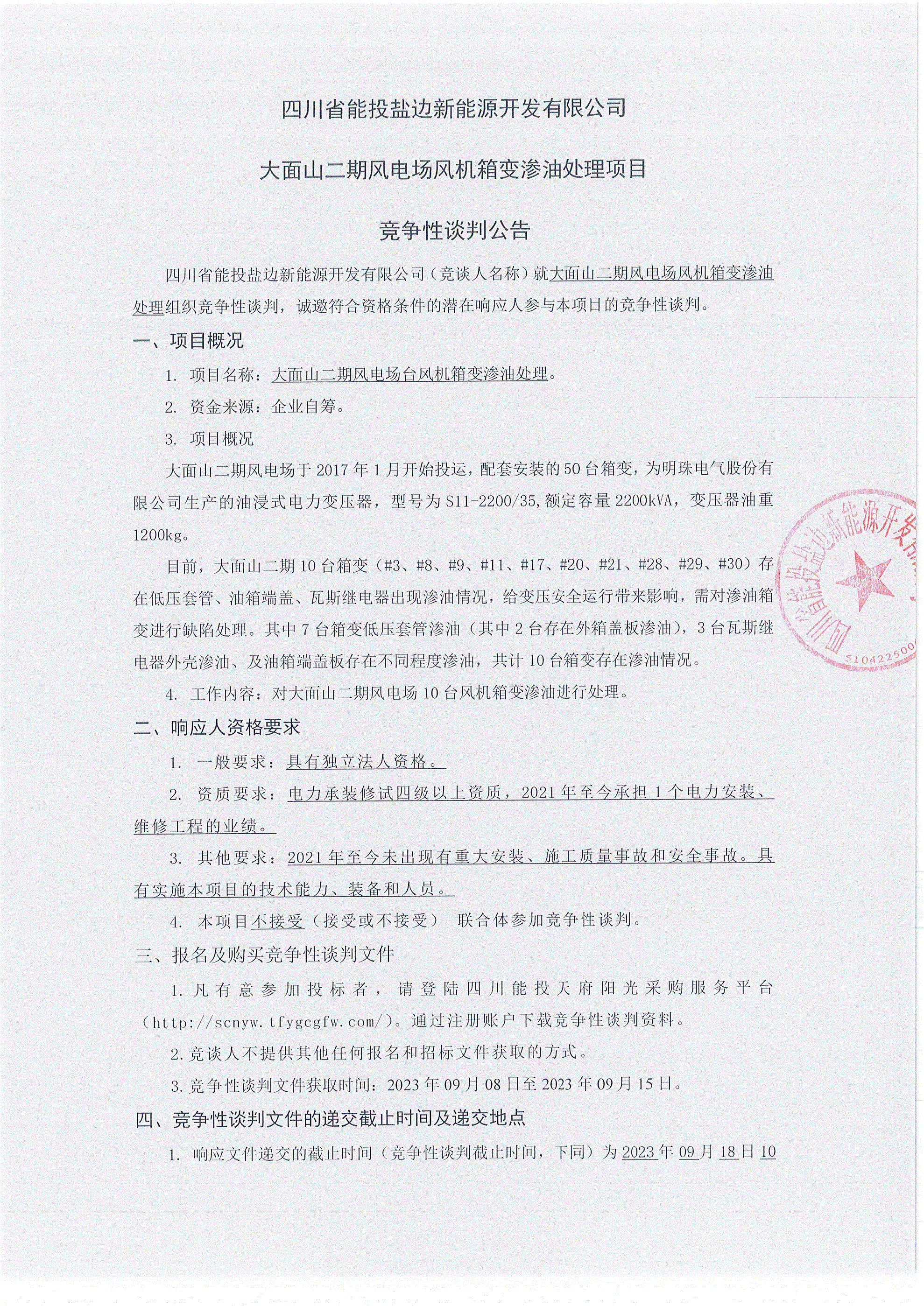 四川省能投盐边新能源开发有限公司(竞谈人名称)就大面山二期风电场风机箱变渗油处理组织竞争性谈判,诚邀符合资格条件的潜在响应人参与本项目的竞争性谈判。
