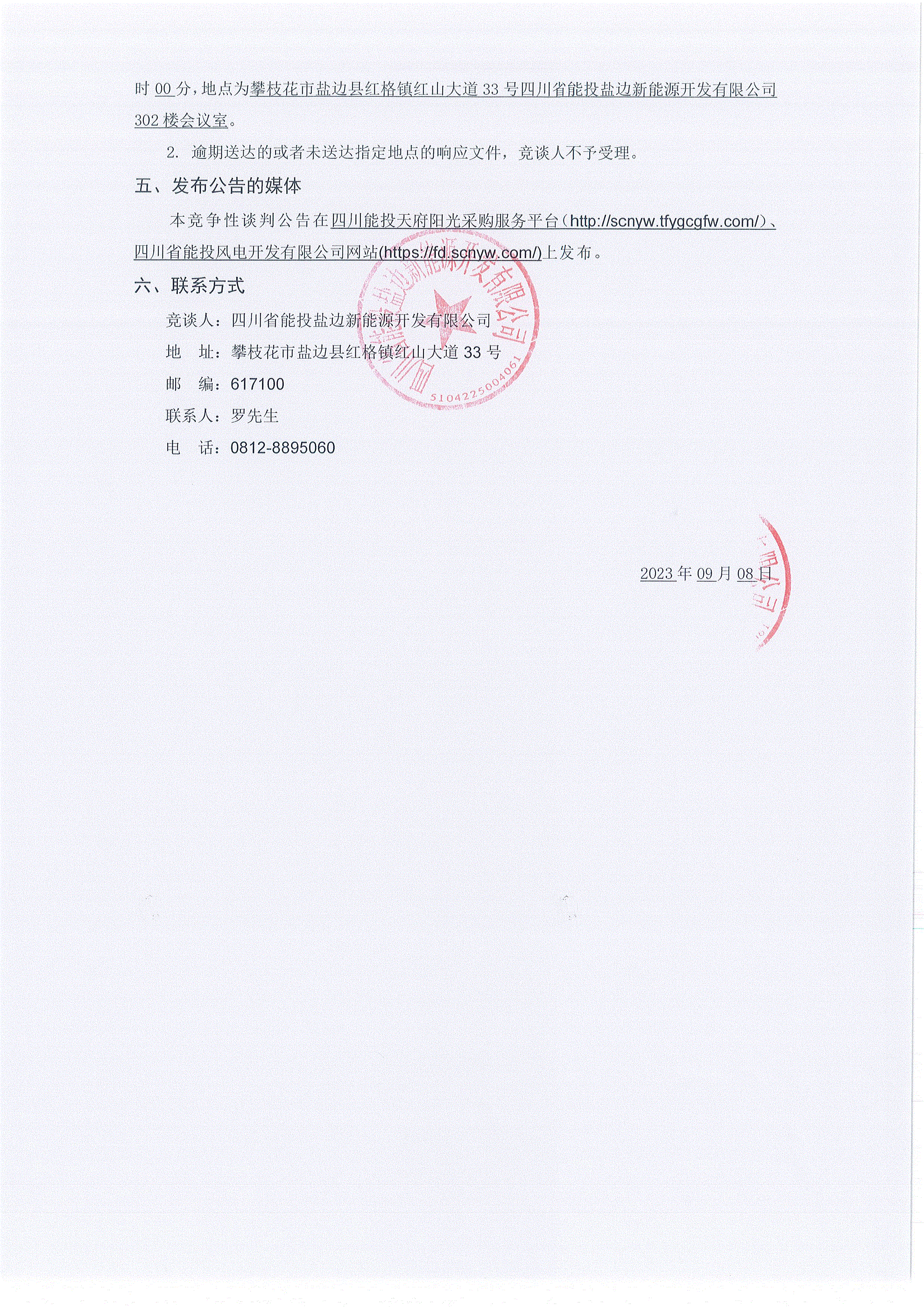 1. 响应文件递交的截止时间(竞争性谈判截止时间,下同)为2023年09月18日10时00分,地点为攀枝花市盐边县红格镇红山大道33号四川省能投盐边新能源开发有限公司302楼会议室。