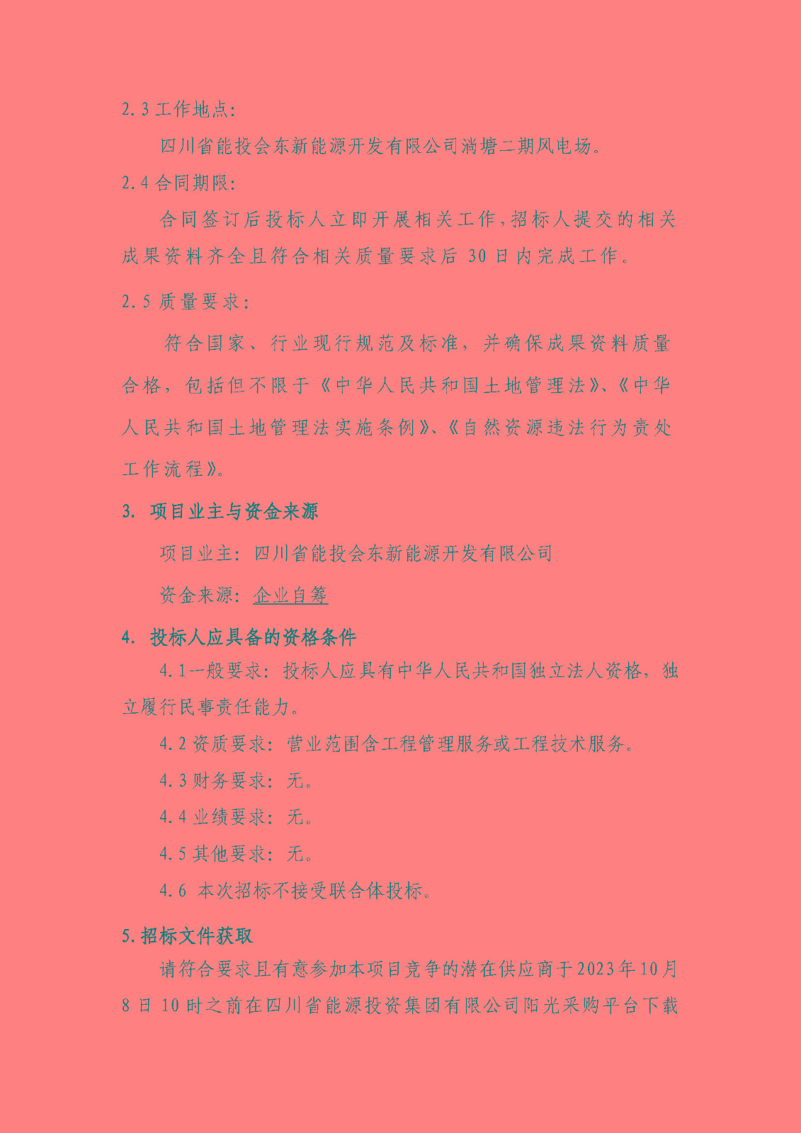 本招标项目为关于解决淌塘二期风电场土地报批过程中涉及卫片违法图斑事宜(第二次)项目,项目业主(招标人)为四川省能投会东新能源开发有限公司,建设资金来自企业自筹。项目出资比例为:100%,项目已具备招标条件,招标人为四川省能投会东新能源开发有限公司。现对该项目进行公开招标。