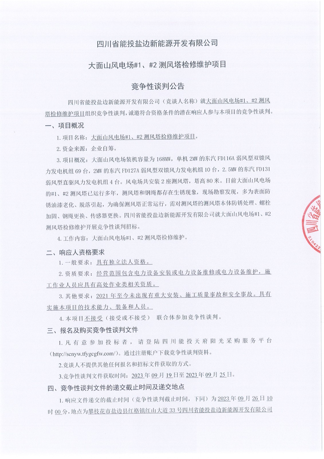 四川省能投盐边新能源开发有限公司(竞谈人名称)就大面山风电场#1、#2测风塔检修维护项目组织竞争性谈判,诚邀符合资格条件的潜在响应人参与本项目的竞争性谈判。