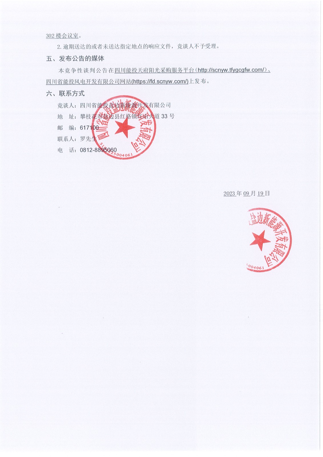 1.响应文件递交的截止时间(竞争性谈判截止时间,下同)为2023年09月26日10时00分,地点为攀枝花市盐边县红格镇红山大道33号四川省能投盐边新能源开发有限公司302楼会议室。