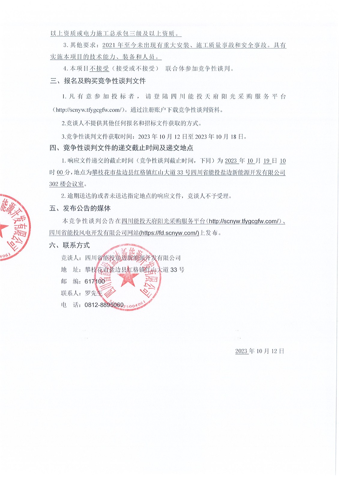 1.响应文件递交的截止时间(竞争性谈判截止时间,下同)为2023年10月19日10时00分,地点为攀枝花市盐边县红格镇红山大道33号四川省能投盐边新能源开发有限公司302楼会议室。