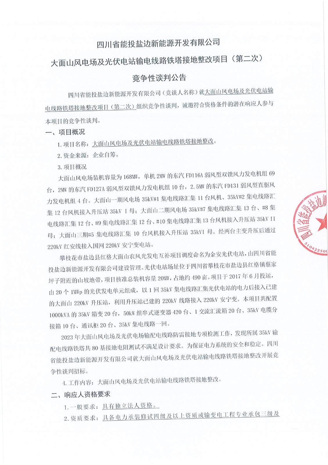 四川省能投盐边新能源开发有限公司(竞谈人名称)就大面山风电场及光伏电站输电线路铁塔接地整改项目(第二次)组织竞争性谈判,诚邀符合资格条件的潜在响应人参与本项目的竞争性谈判。