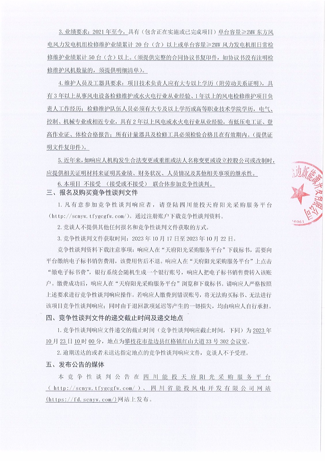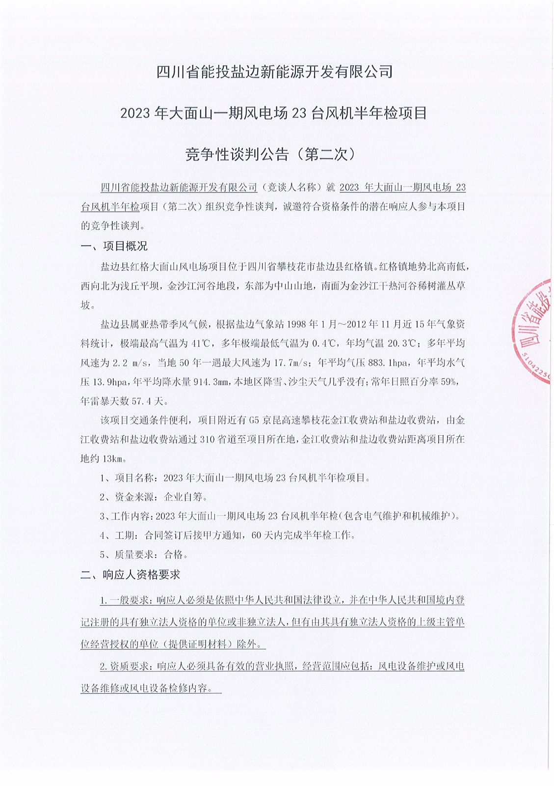 四川省能投盐边新能源开发有限公司(竞谈人名称)就2023年大面山一期风电场23台风机半年检项目(第二次)组织竞争性谈判,诚邀符合资格条件的潜在响应人参与本项目的竞争性谈判。