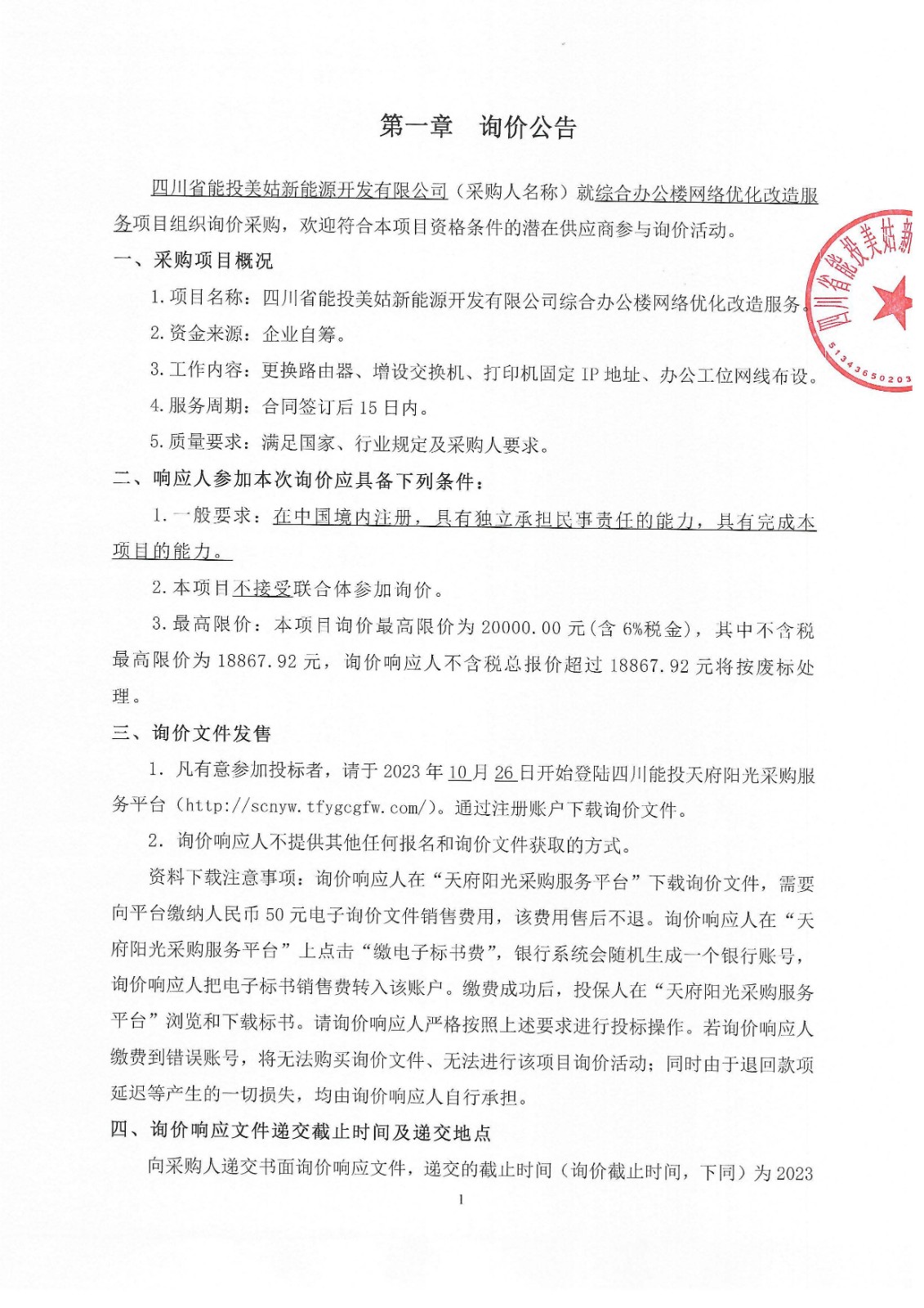 1.凡有意参加投标者,请于2023年10月26日开始登陆四川能投天府阳光采购服务平台(http://scnyw.tfygcgfw.com/)。通过注册账户下载询价文件。