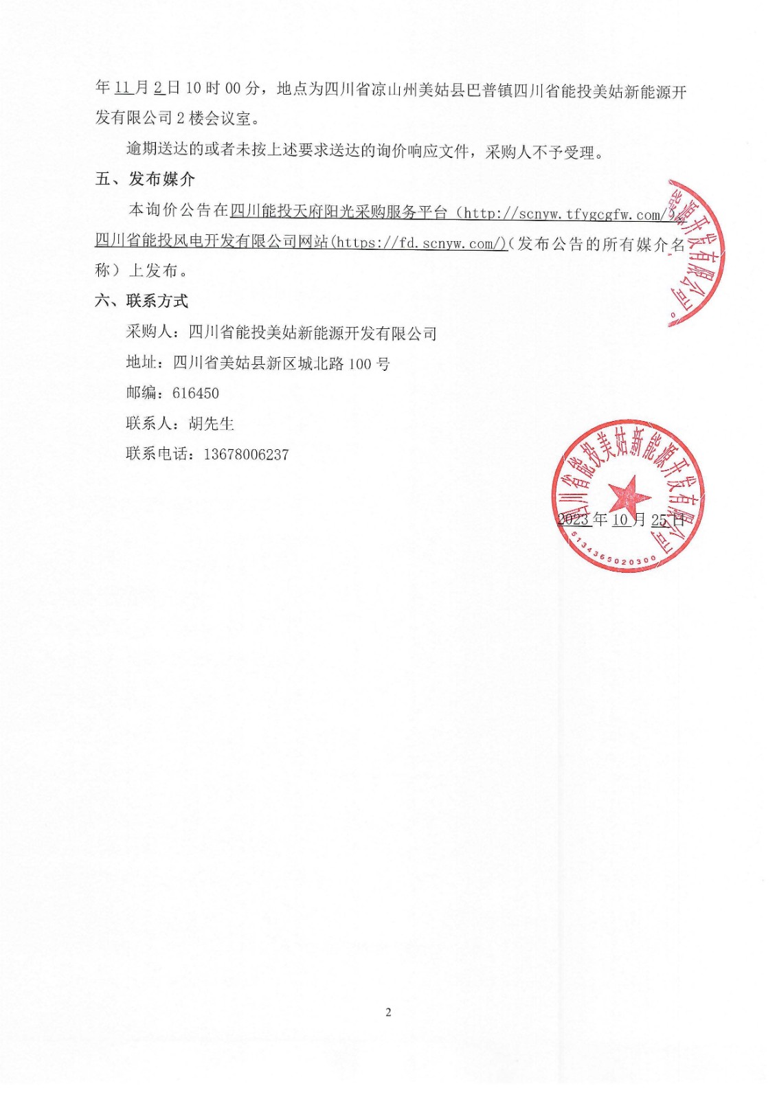 向采购人递交书面询价响应文件,递交的截止时间(询价截止时间,下同)为2023年11月2日10时00分,地点为四川省凉山州美姑县巴普镇四川省能投美姑新能源开发有限公司2楼会议室。