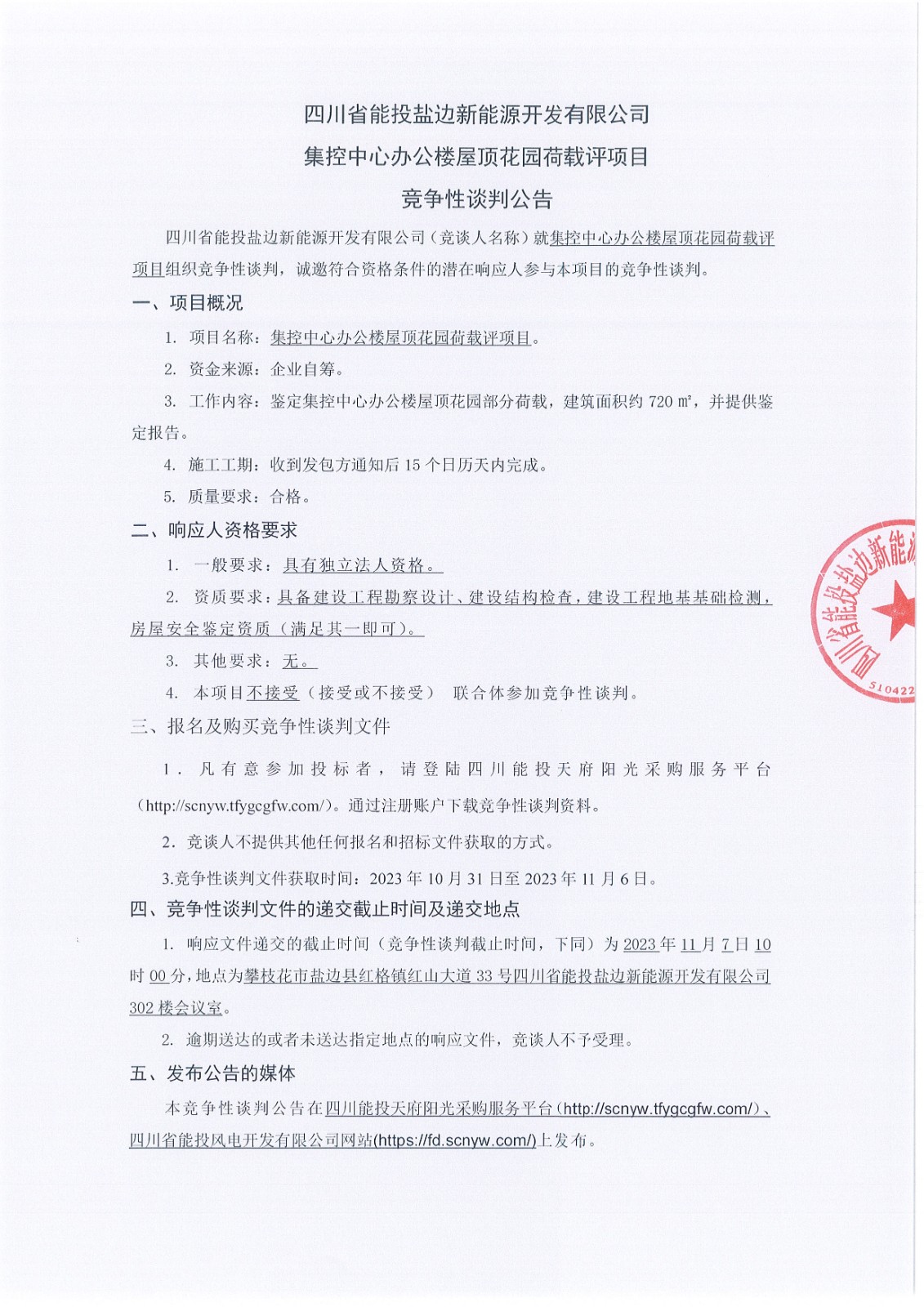 四川省能投盐边新能源开发有限公司(竞谈人名称)就集控中心办公楼屋顶花园荷载评项目组织竞争性谈判,诚邀符合资格条件的潜在响应人参与本项目的竞争性谈判。