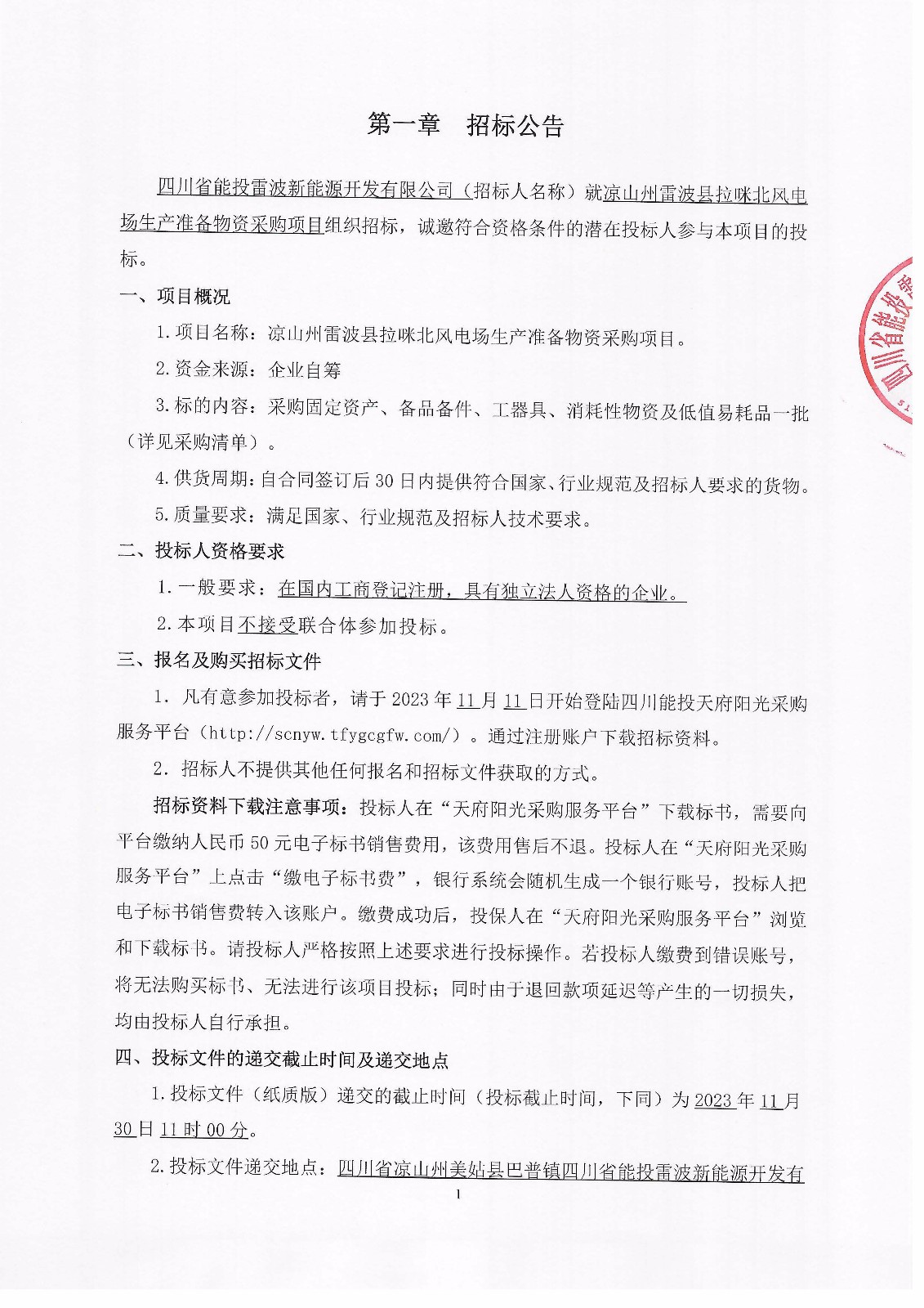 1.项目名称:凉山州雷波县拉咪北风电场生产准备物资采购项目。