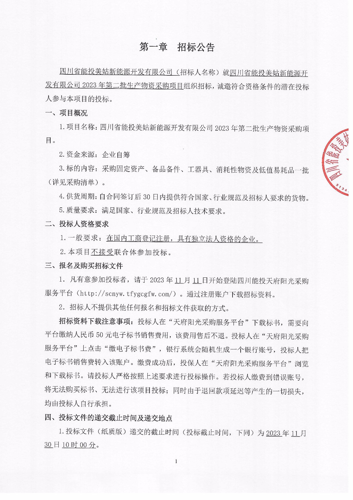 1.项目名称:四川省能投美姑新能源开发有限公司2023年第二批生产物资采购项目。